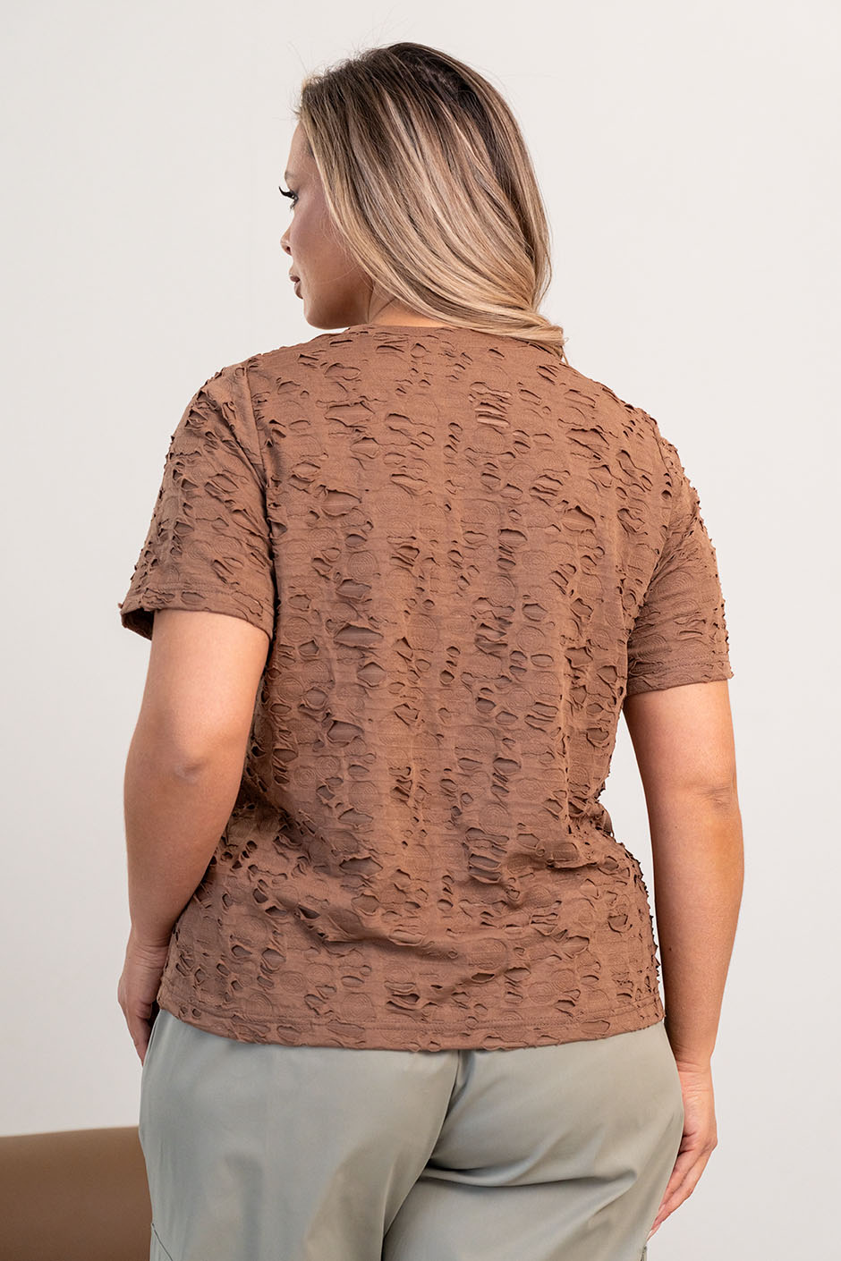 Ткань: кулирная гладь фукро с декоративным эффектом "рванка". Футболка прямого покроя, круглый вырез. Рукав короткий. Длина изд.ок.65см.
