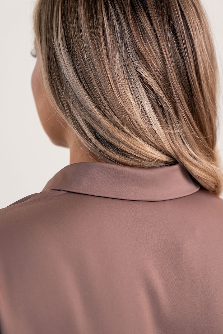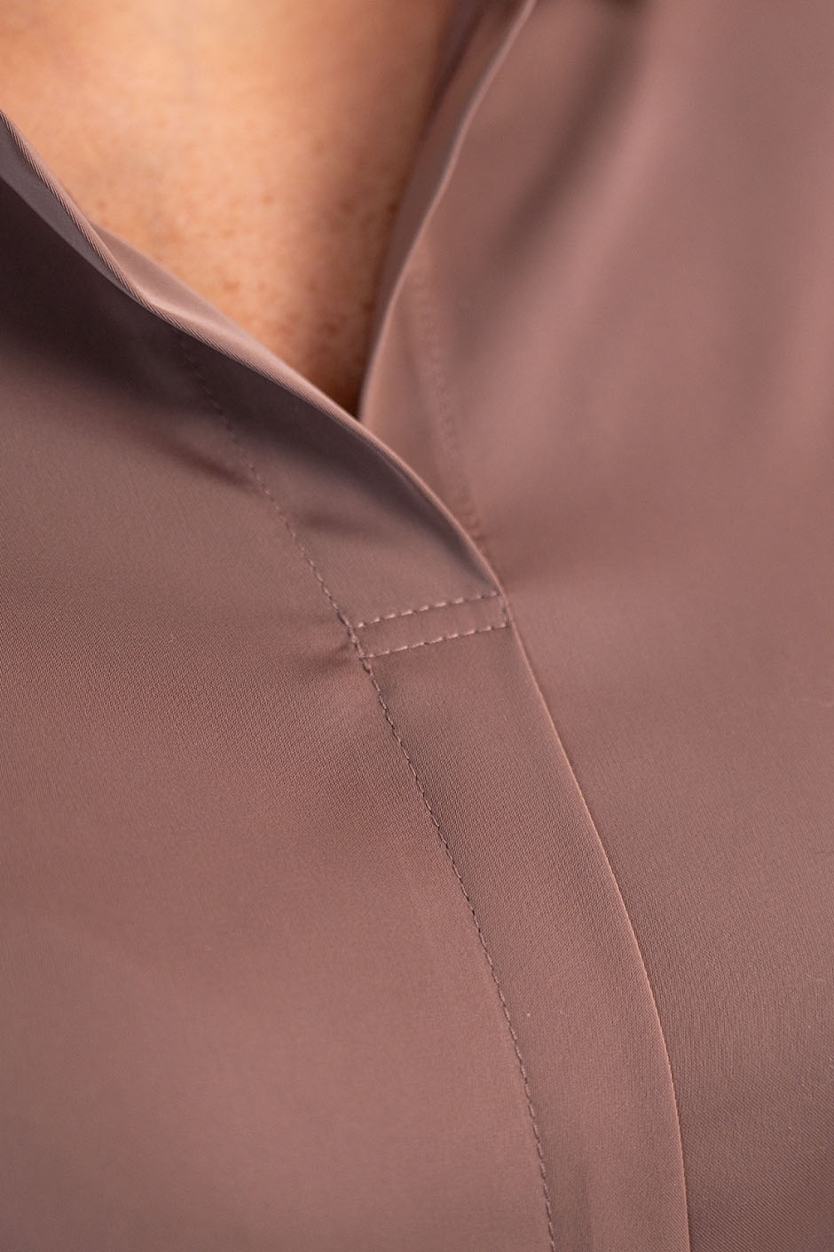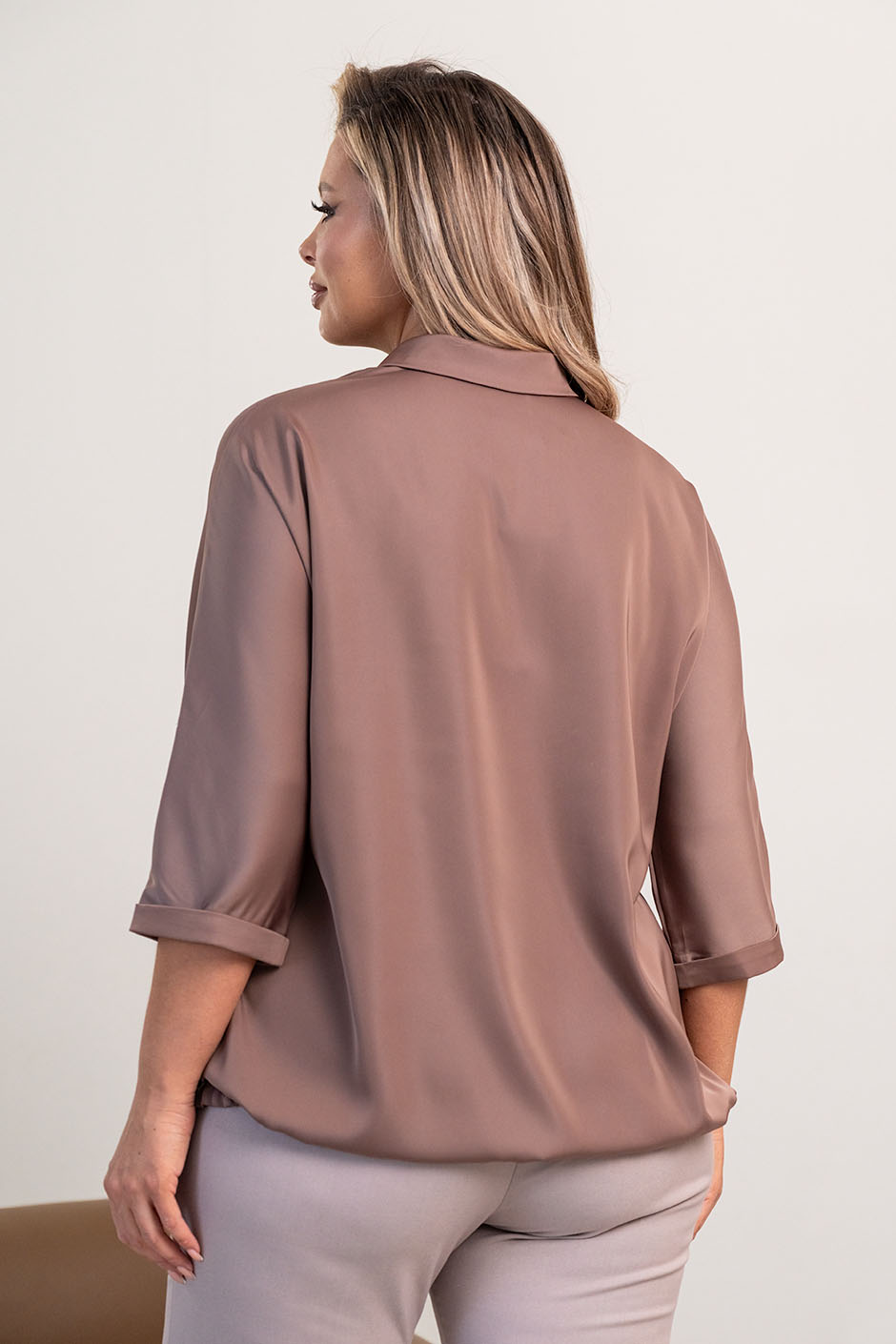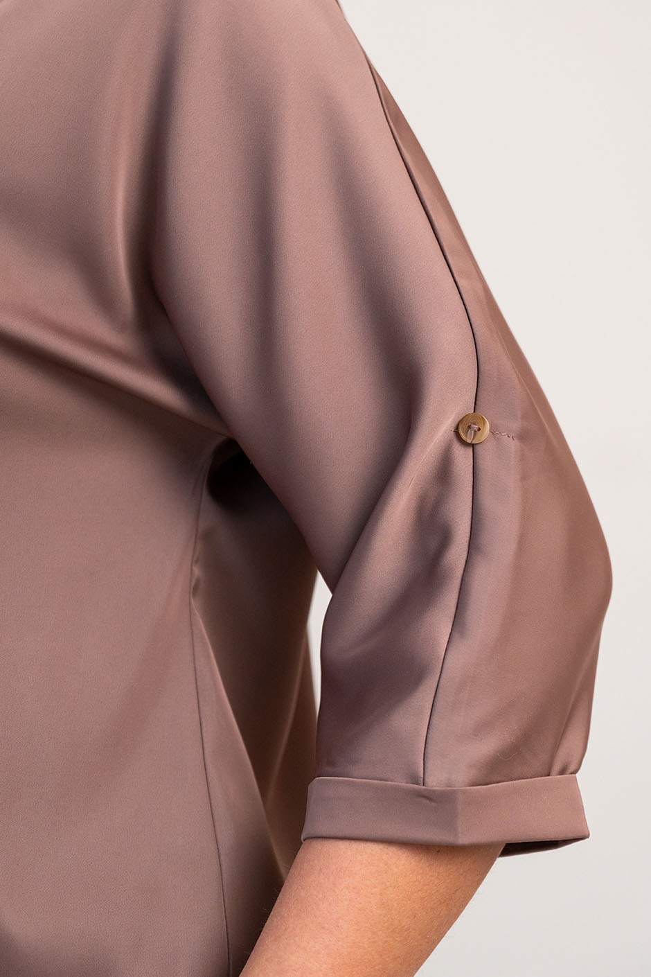 Ткань: японский шелк. Блуза свободного покроя, воротник на стойке, спереди – имитация супатной застежки по всей длине, низ изделия на кулиске. Рукав цельнокроеный, на манжете, регулируется патой. Длина ок. 65 см.
