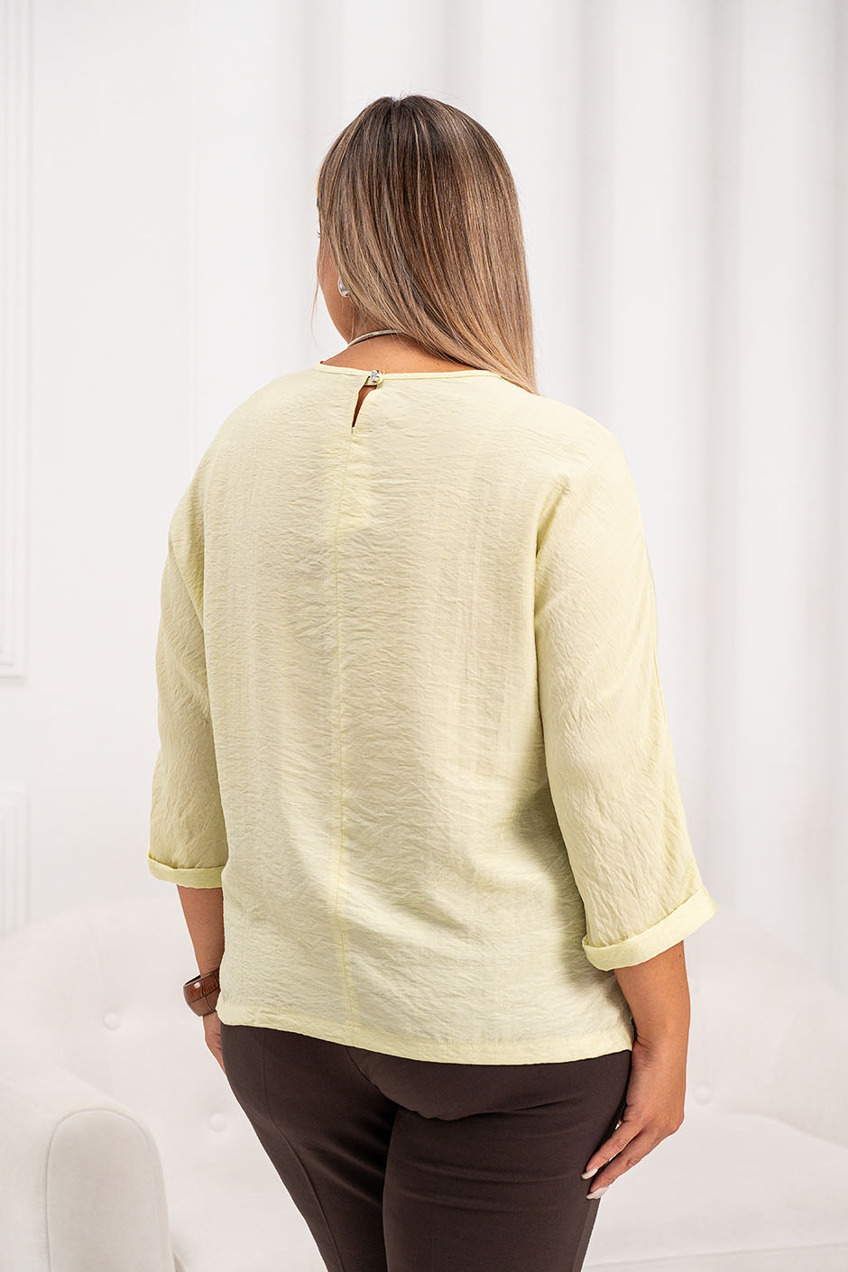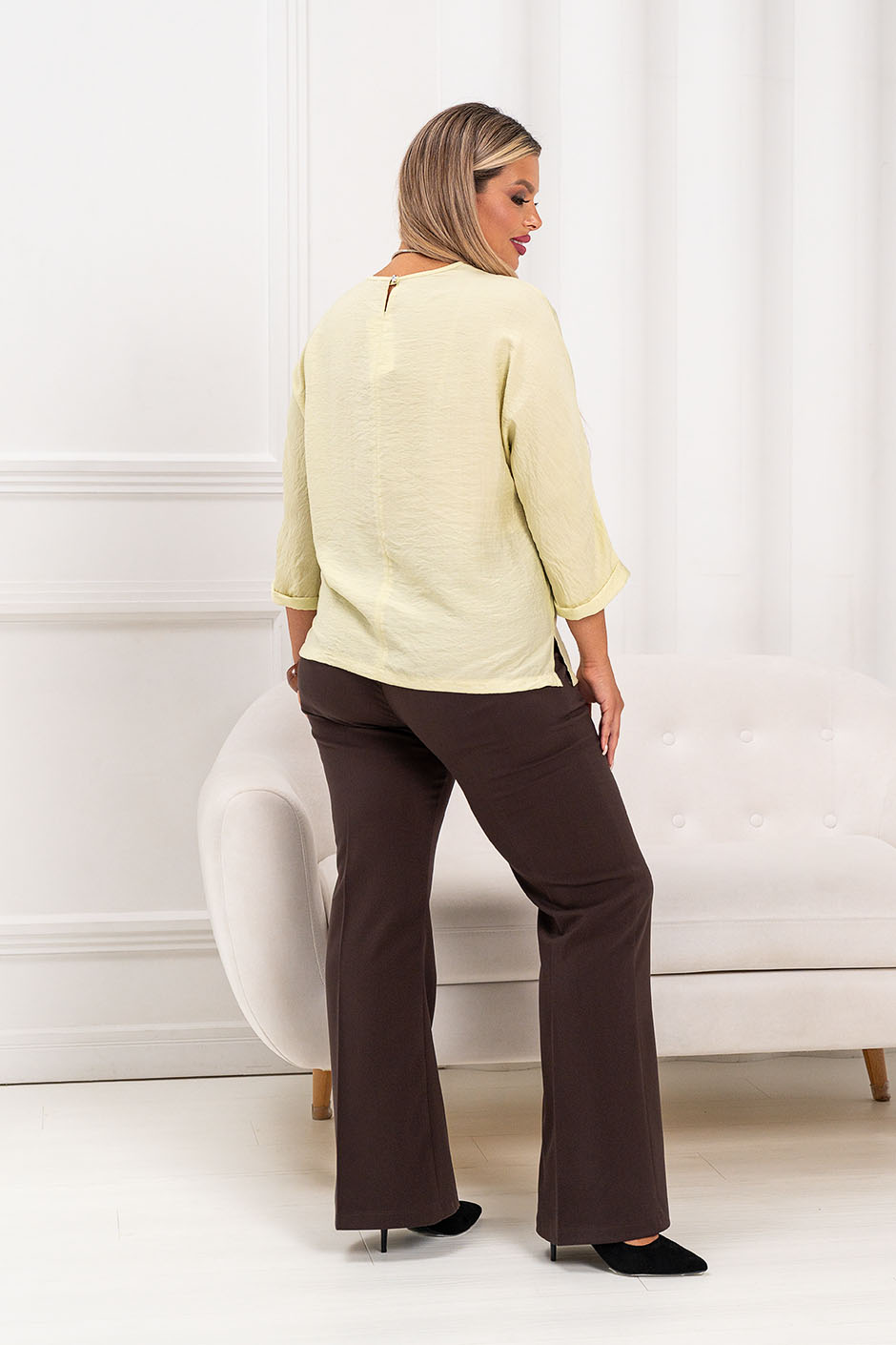 Ткань: лен с вискозой, полированный с эффектом креш. Блузка прямого покроя,с боковыми разрезами, с цельнокроеным рукавом. Рукав 3\4 на манжете. Длина изд.ок. 62см.