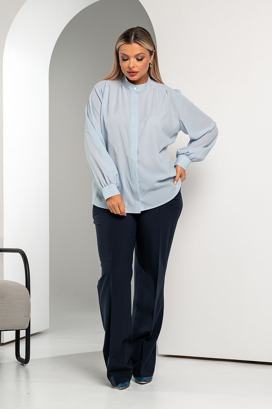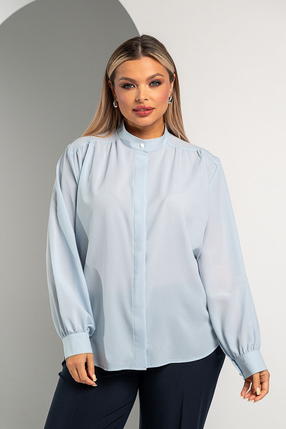 Ткань: креп однотонный.Блузка свободного покроя, спереди супатная застежка, воротник на стойке, по плечам кокетка. Рукав втачной, длинный, на манжете с двумя пуговицами. Длина изд. ок.72см.