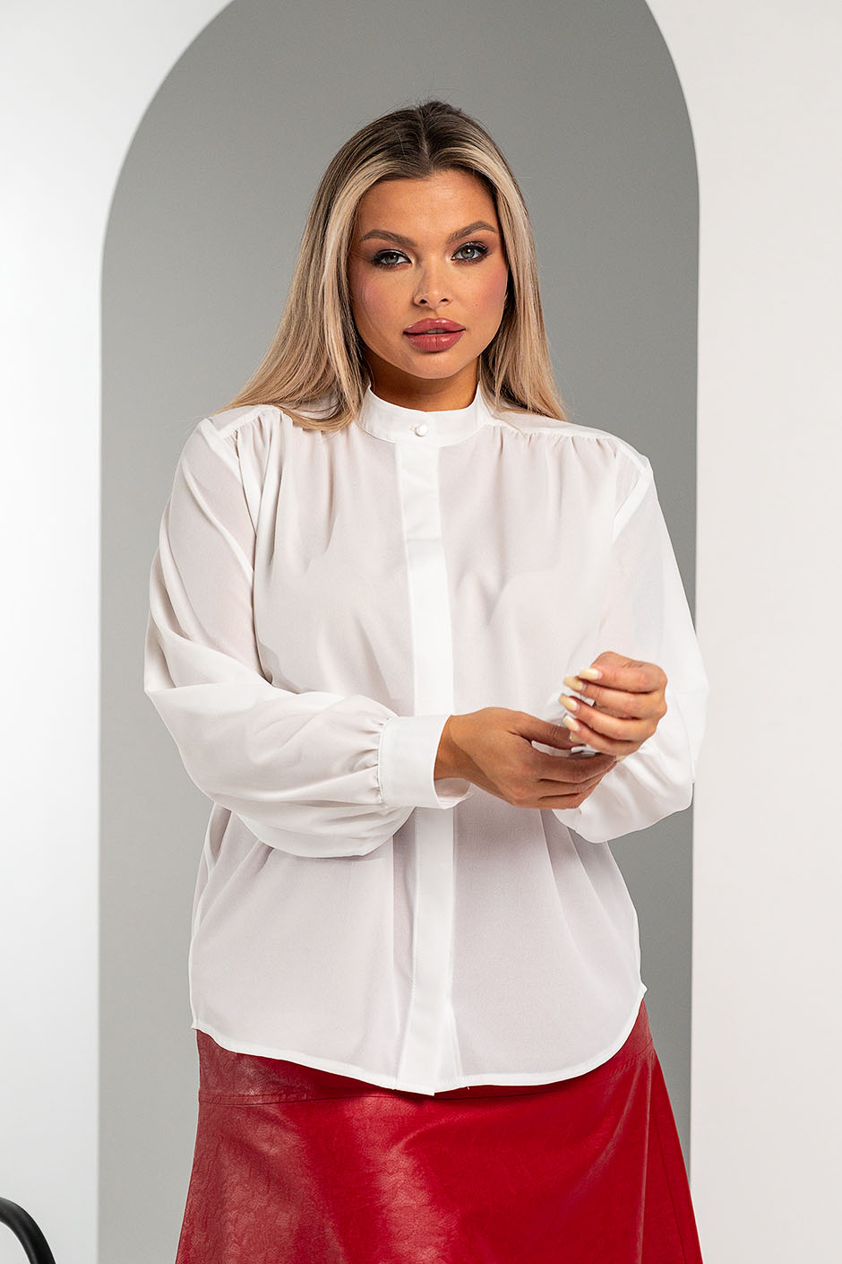Ткань: креп однотонный.Блузка свободного покроя, спереди супатная застежка, воротник на стойке, по плечам кокетка. Рукав втачной, длинный, на манжете с двумя пуговицами. Длина изд. ок.72см.