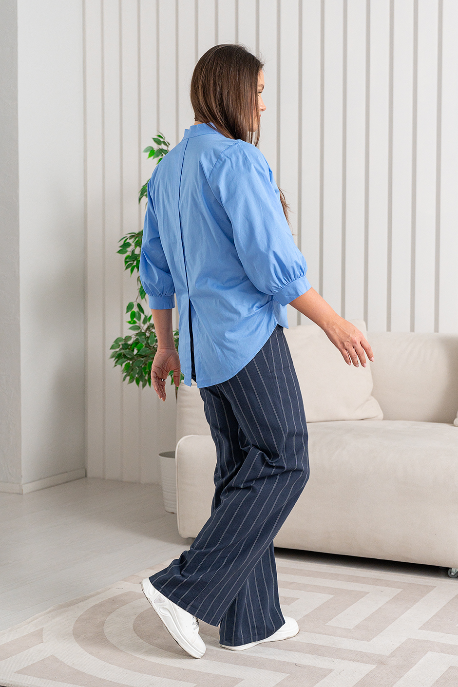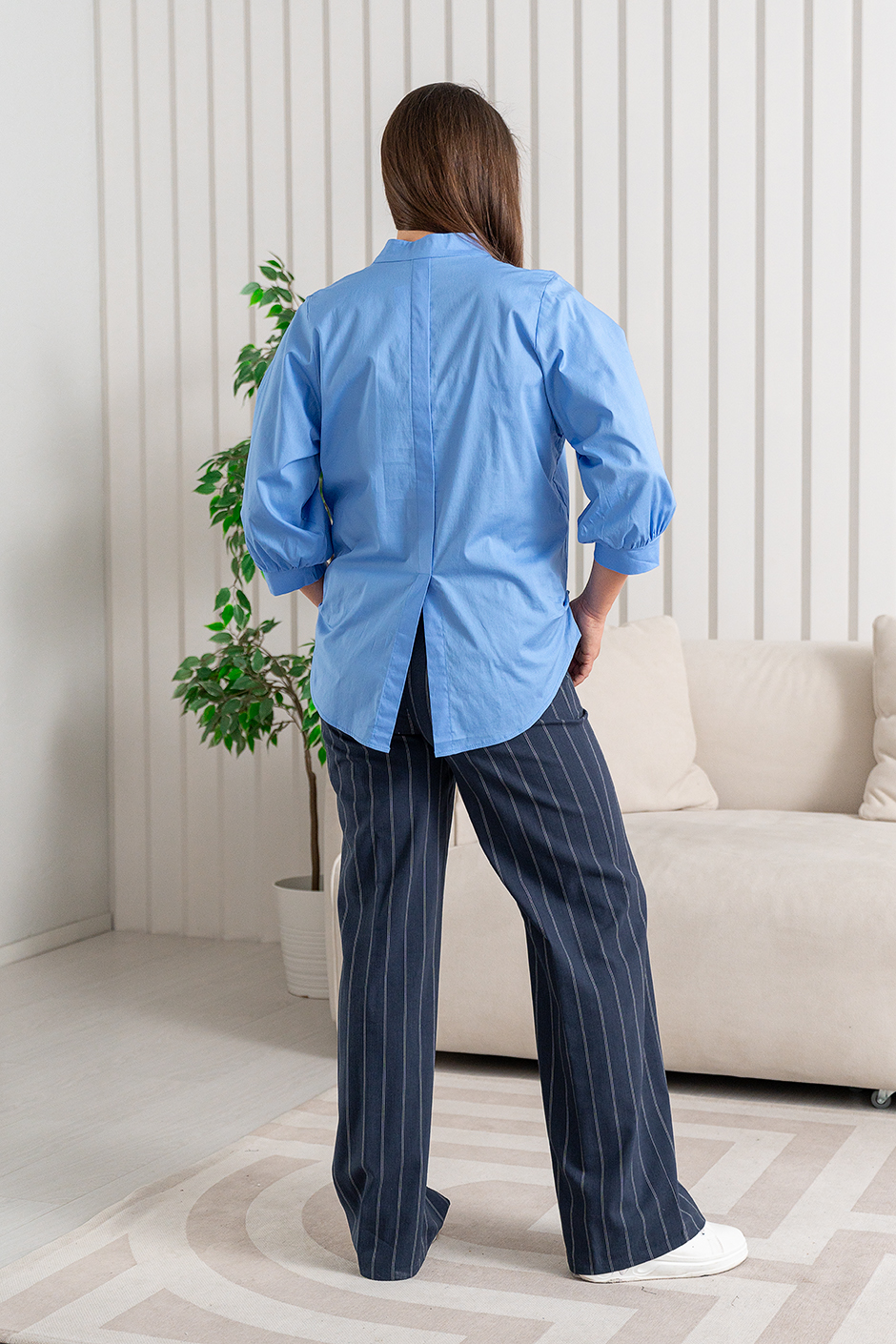 Ткань: хлопок однотонный. Блузка свободного покроя, спереди имитация застежки, по горловине лежачая стойка,по боковым швам защипы, по спинке имитация застежки. Рукав втачной, насборенный,на манжете.Длина изд.по переду ок.64см, по спинке ок 74см.