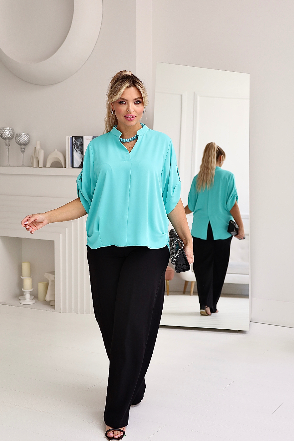 Ткань: дубайский шелк. Блузка свободного покроя, спереди имитация застежки, по горловине лежачая стойка,по боковым швам защипы, по спинке имитация застежки. Рукав втачной, до локтя с патой.Длина изд.по переду ок.64см, по спинке ок 74см.