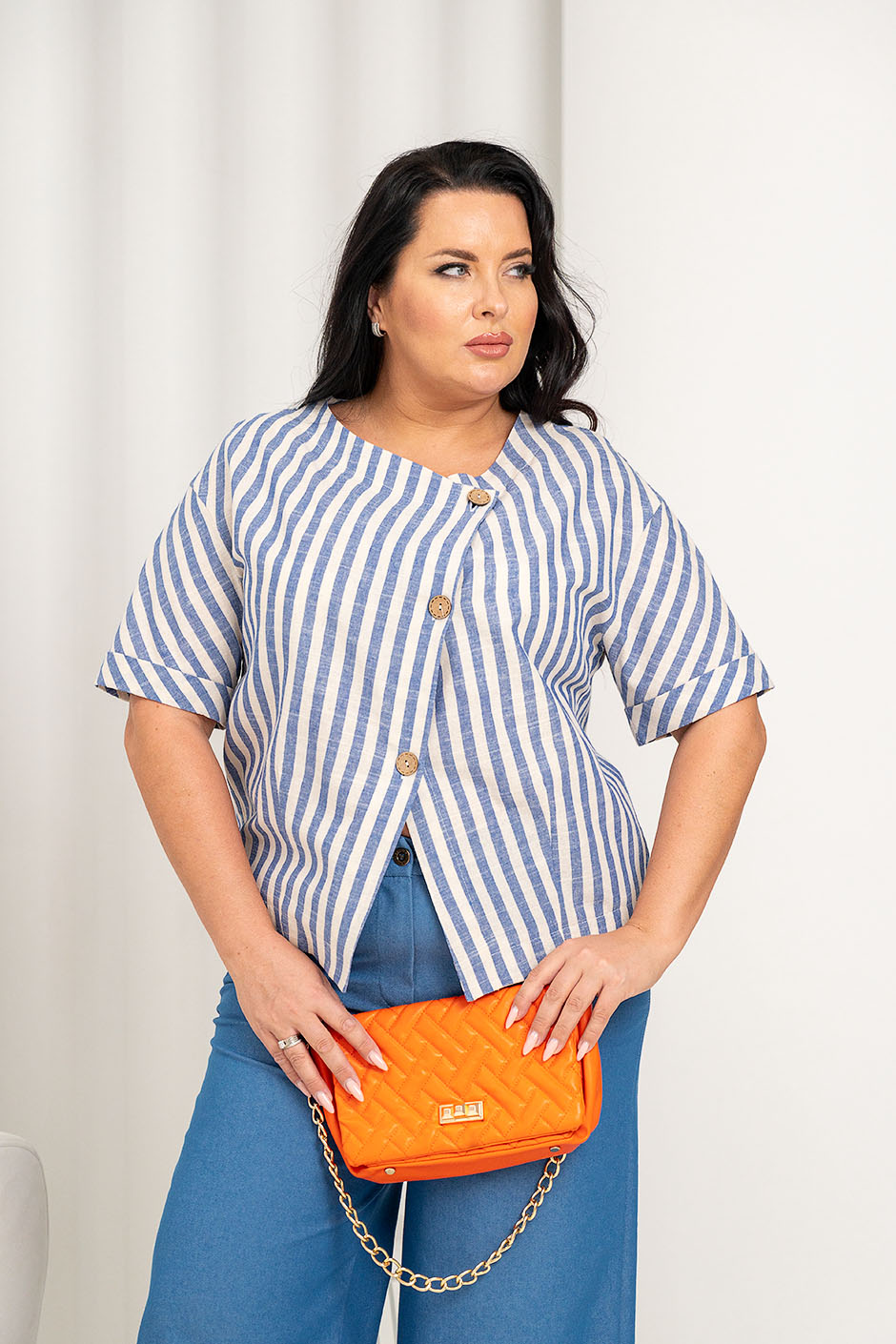 Ткань: лен. Блузка свободного покроя, с цельнокроеным рукавом, по низу рукава манжет, спереди ассиметричная застежка на три пуговицы, с неровным низом. Рукав до локтя. Длина изд. ок.60см.