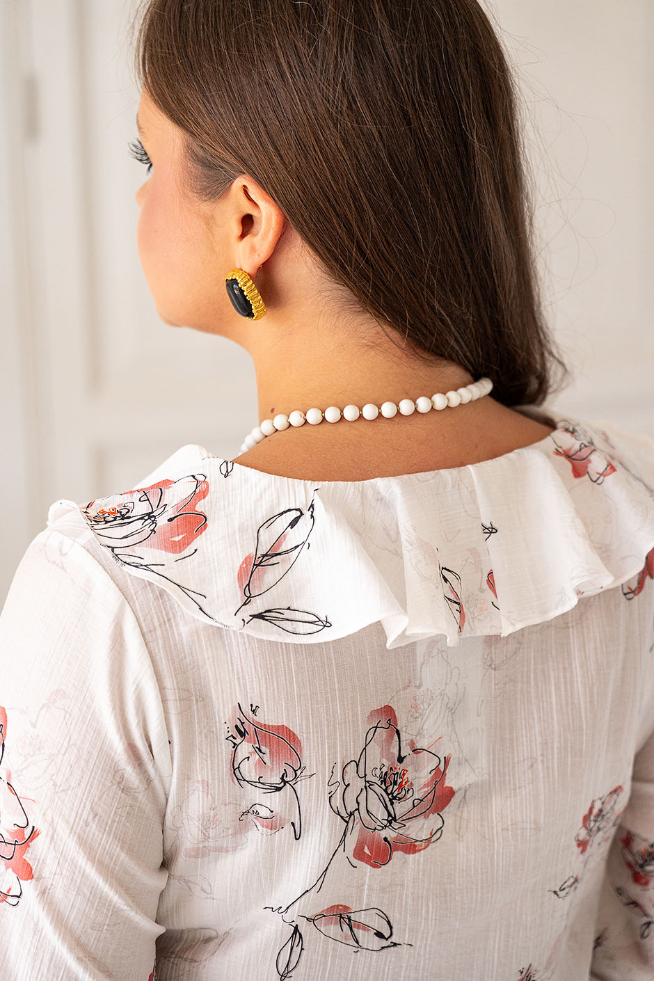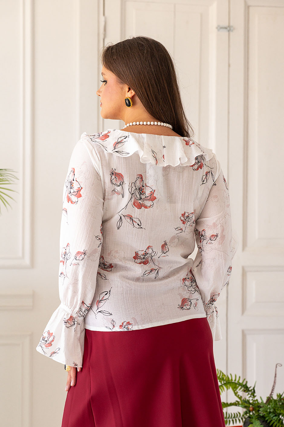 Ткань: хлопок полированный набивной. Блузка простого покроя, с V-образным вырезом, по вырезу рюша, Рукав длинный с рюшей.. Длина изд. ок.65см.