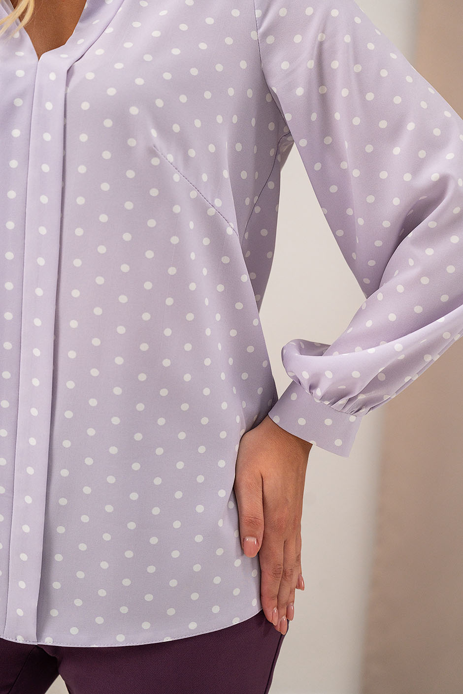 Ткань: искусственный шелк. Блузка прямого покроя, спереди бантовая складка, переходящая в лежачую стойку. Рукав втачной, длинный на манжете. Длина изд.ок.65см.