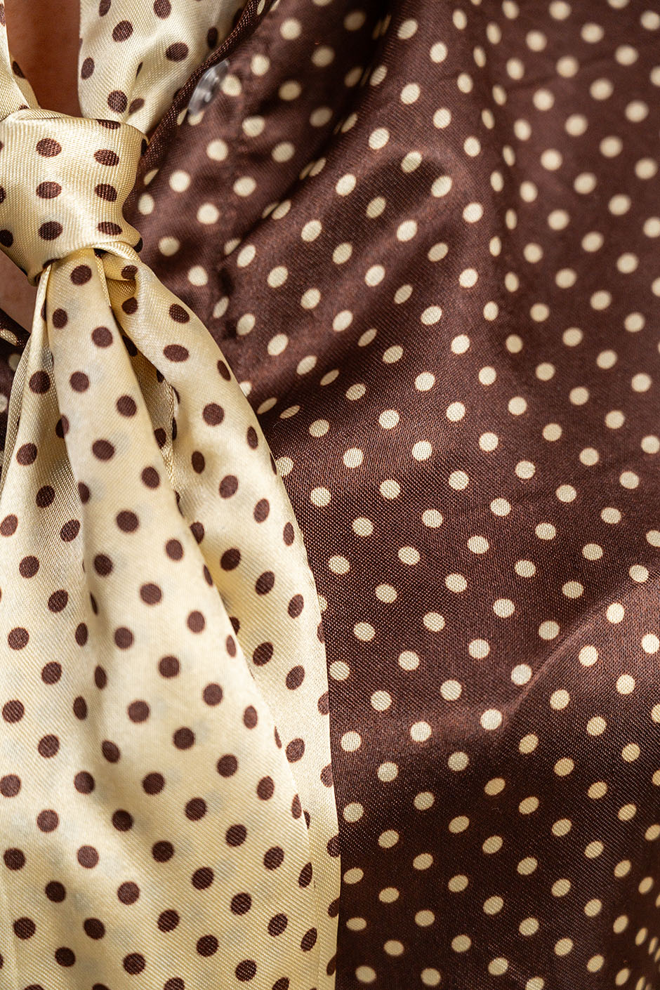 Ткань: искусственный шелк. Блузка простого, прямого силуэта, воротник на стойке, спереди супатная застежка на пуговицы. К блузке прилагается галстук.Рукав длинный, пышный на широком манжете. Длина изд.ок. 65 см.