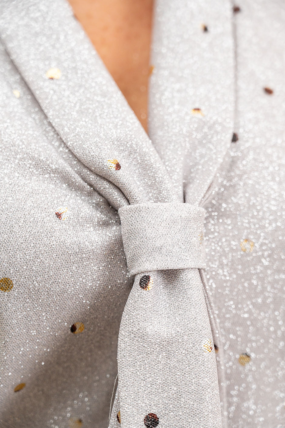 Ткань: трикотажное полотно с люрексом. Блузка прямого покроя, со спущенным рукавом, шалевым с воротником переходящим в галстук. Длина изд.ок 65 см.