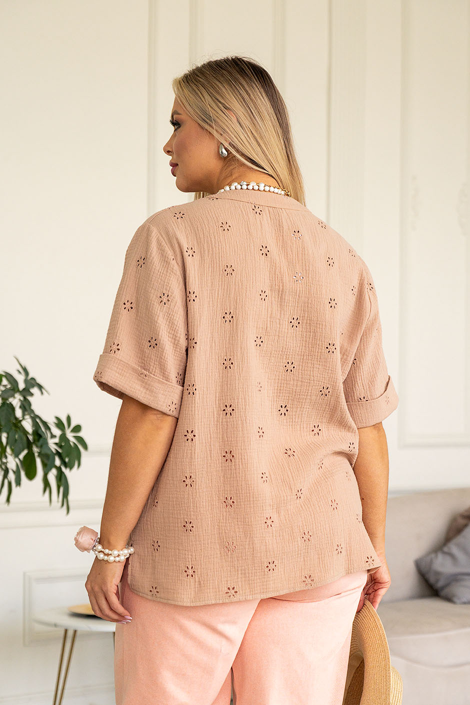 Ткань: муслин, хлопок 100%. Блуза прямого покроя, спереди по горловине лежачая стойка и планка с пуговицами. Рукав до локтя на манжете. Длина изд.ок.66 см.