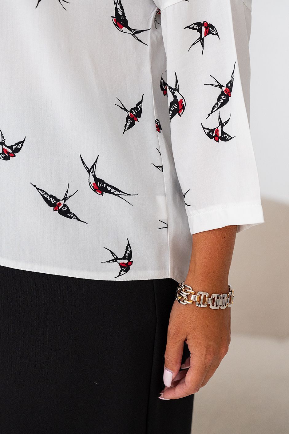 Ткань: хлопок набивной. Блуза простого свободного покроя, с цельнокроеным  рукавом. Рукав длиной ¾. Длина ок. 60 см., по спинке немного длиннее.