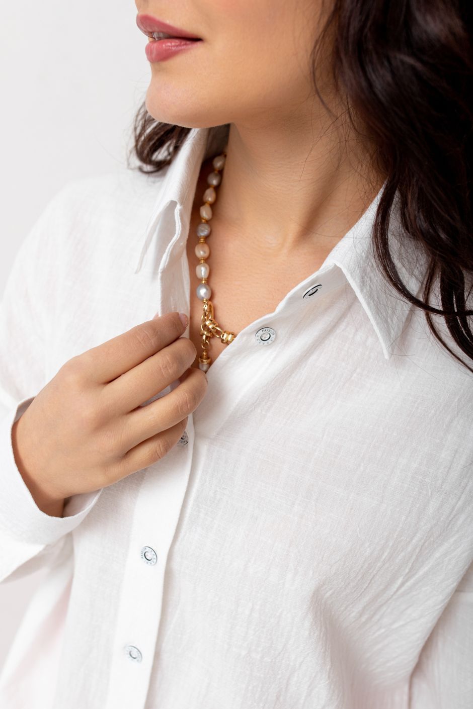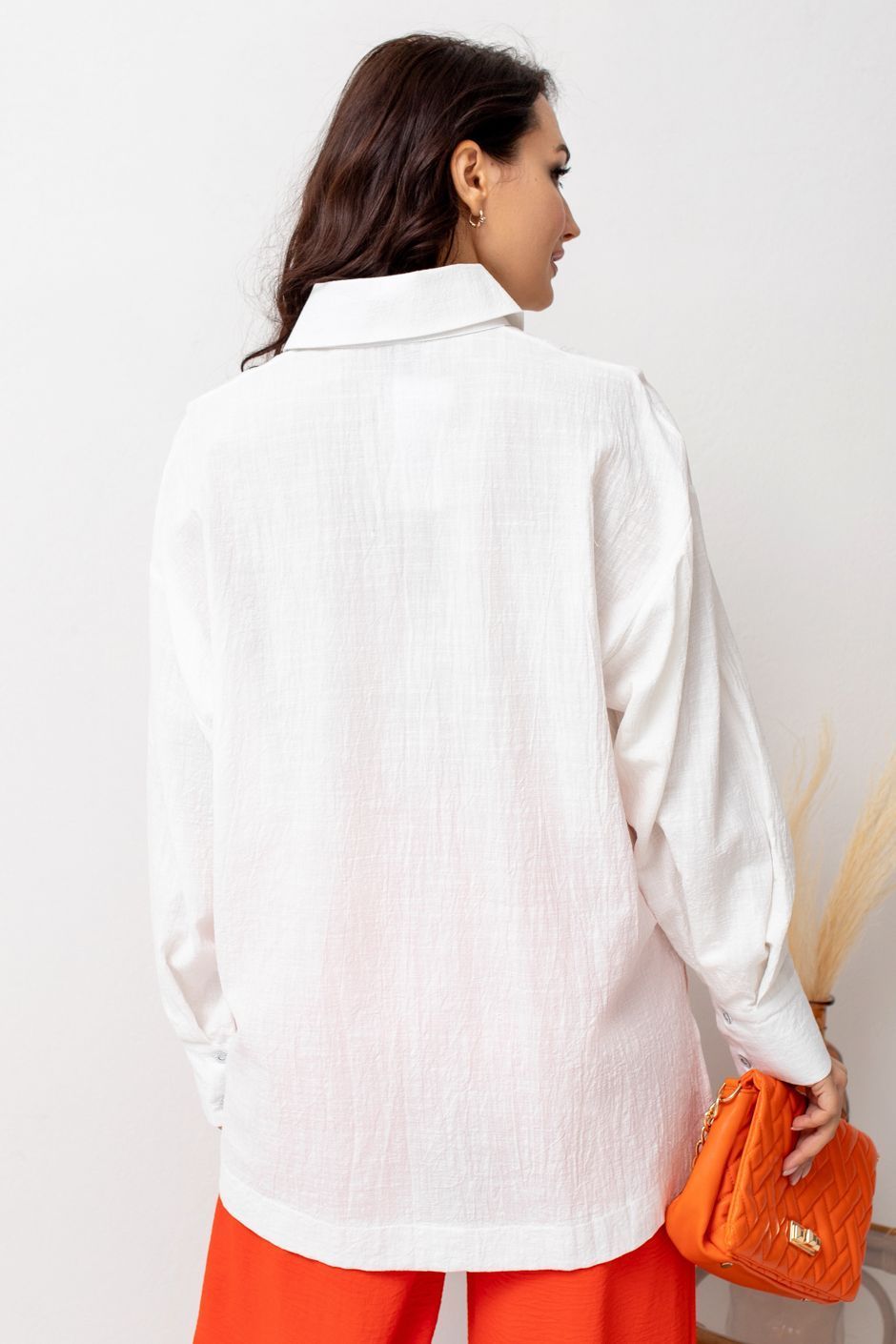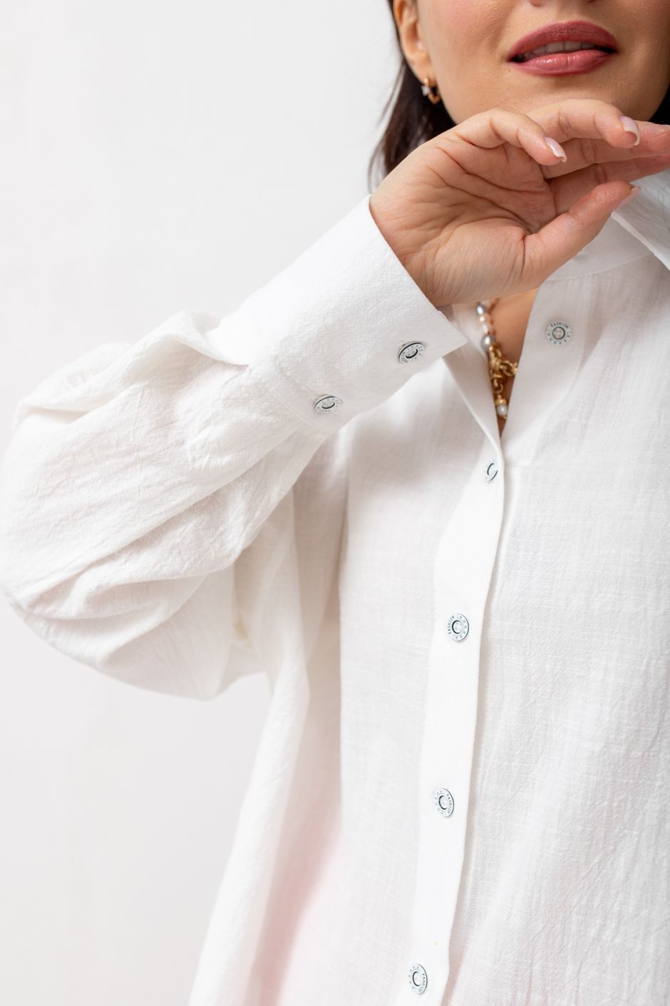 Ткань: хлопок однотонный с эффектом креш. Рубашка очень свободного покроя, линия плеча занижена, воротник на стойке, спереди застежка на пуговицы. Рукав длинный, на манжете.
