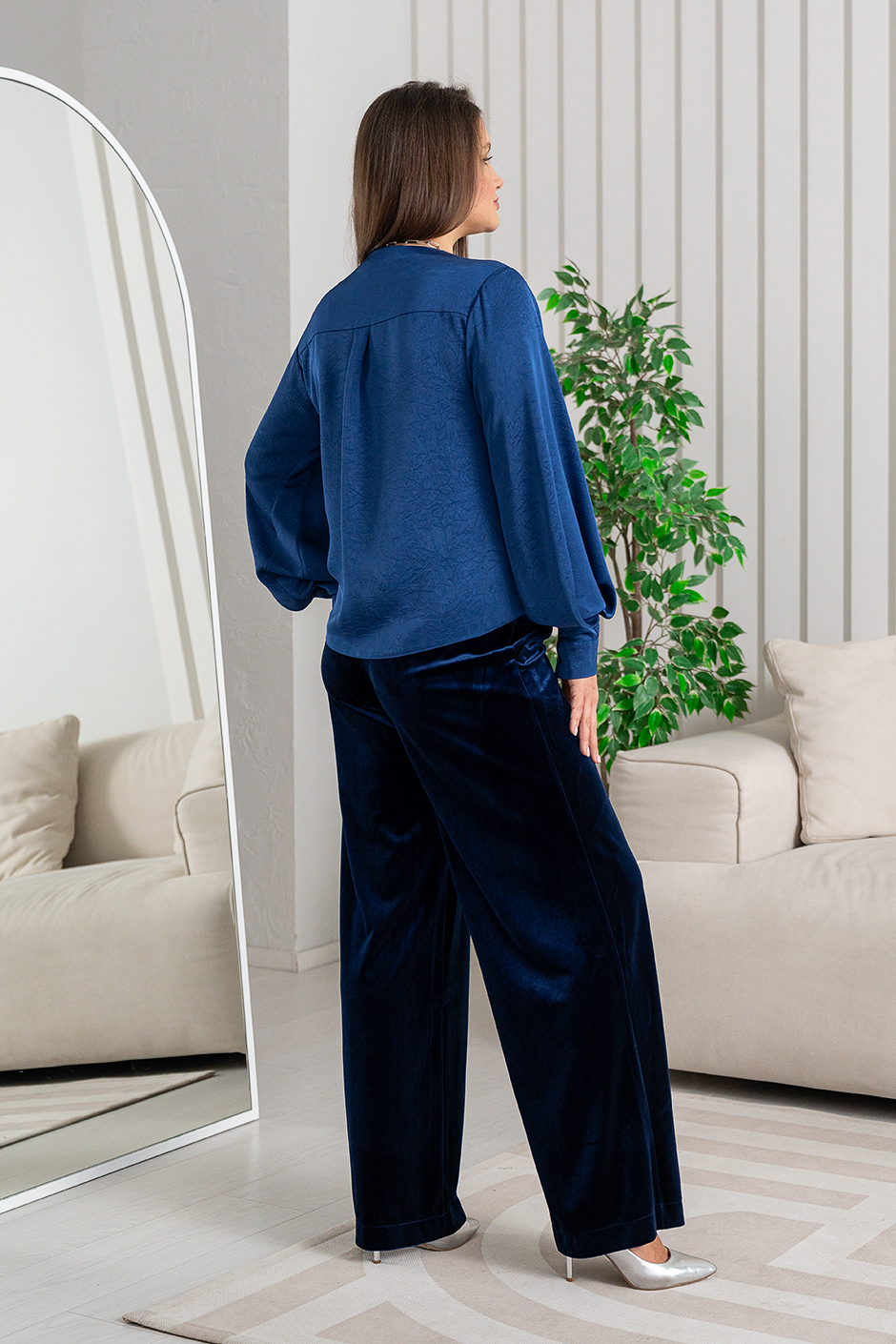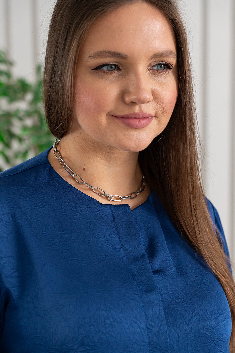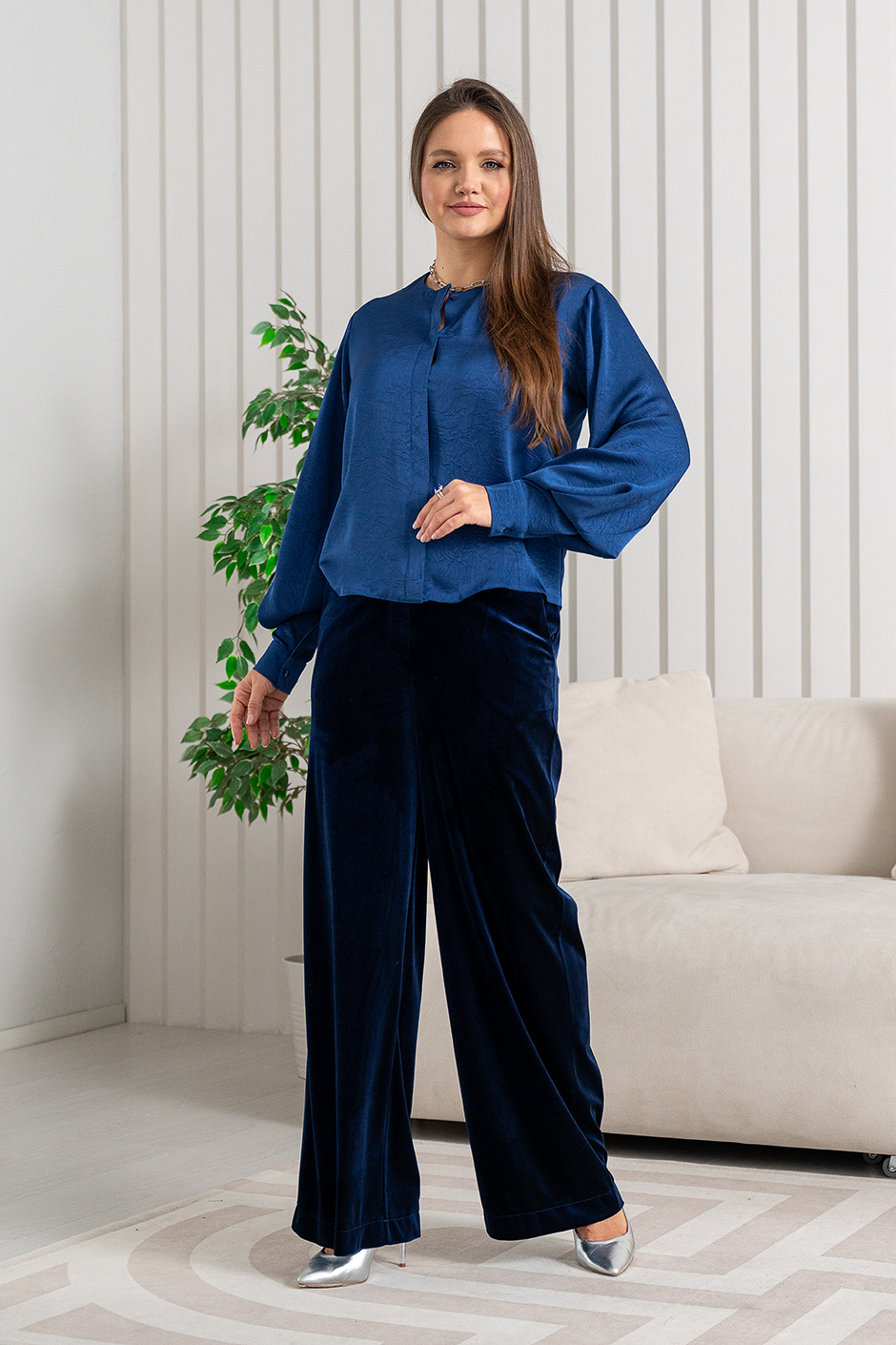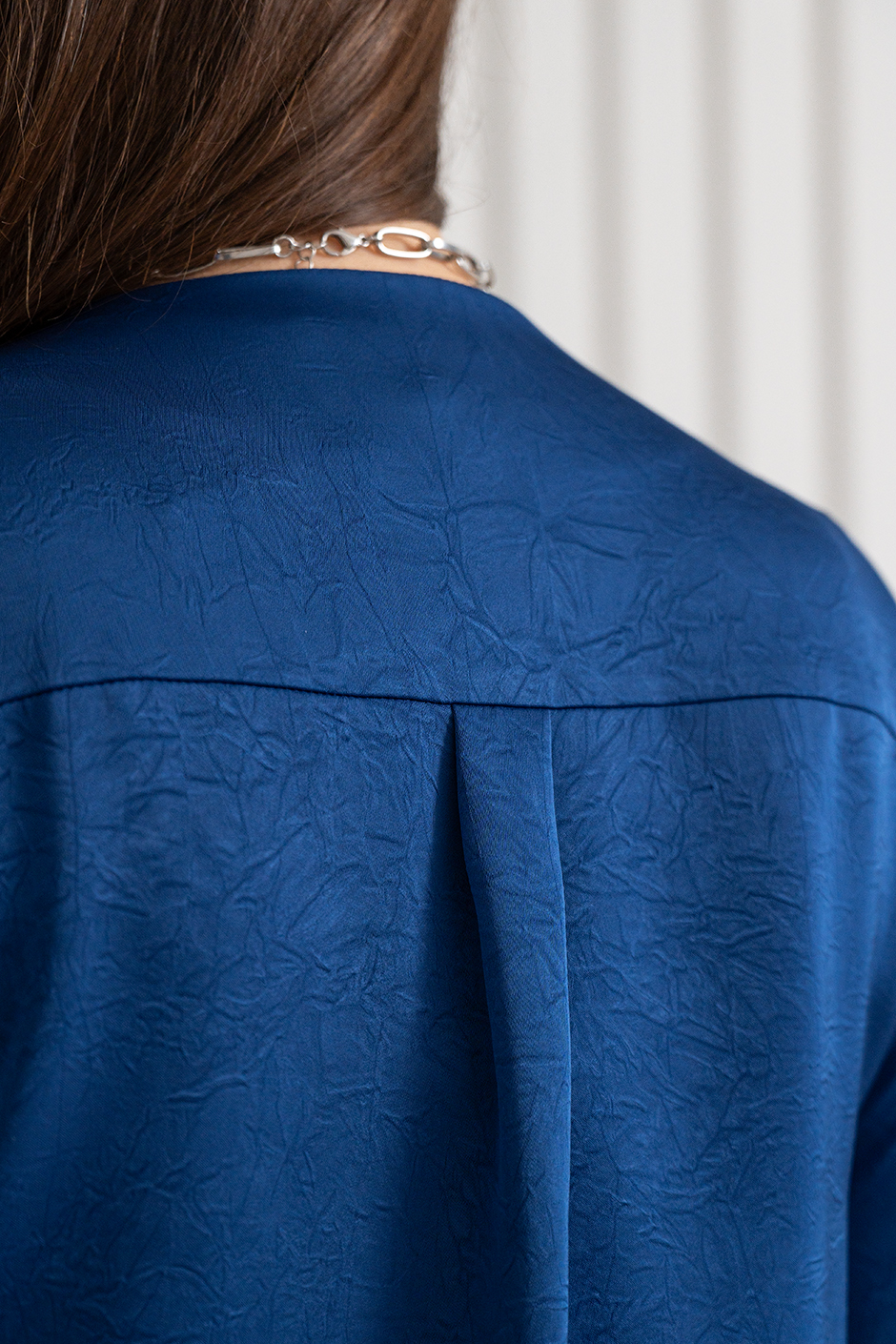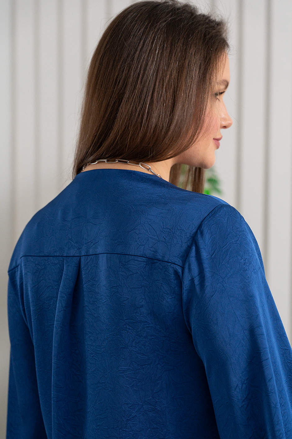 Ткань: креш-шелк. Блузка простого покроя, спереди супатная застежка на пуговицы, по спинке кокетка, рукав пышный с подкройным объемом, длинный на манжете. Длина ок.63см.