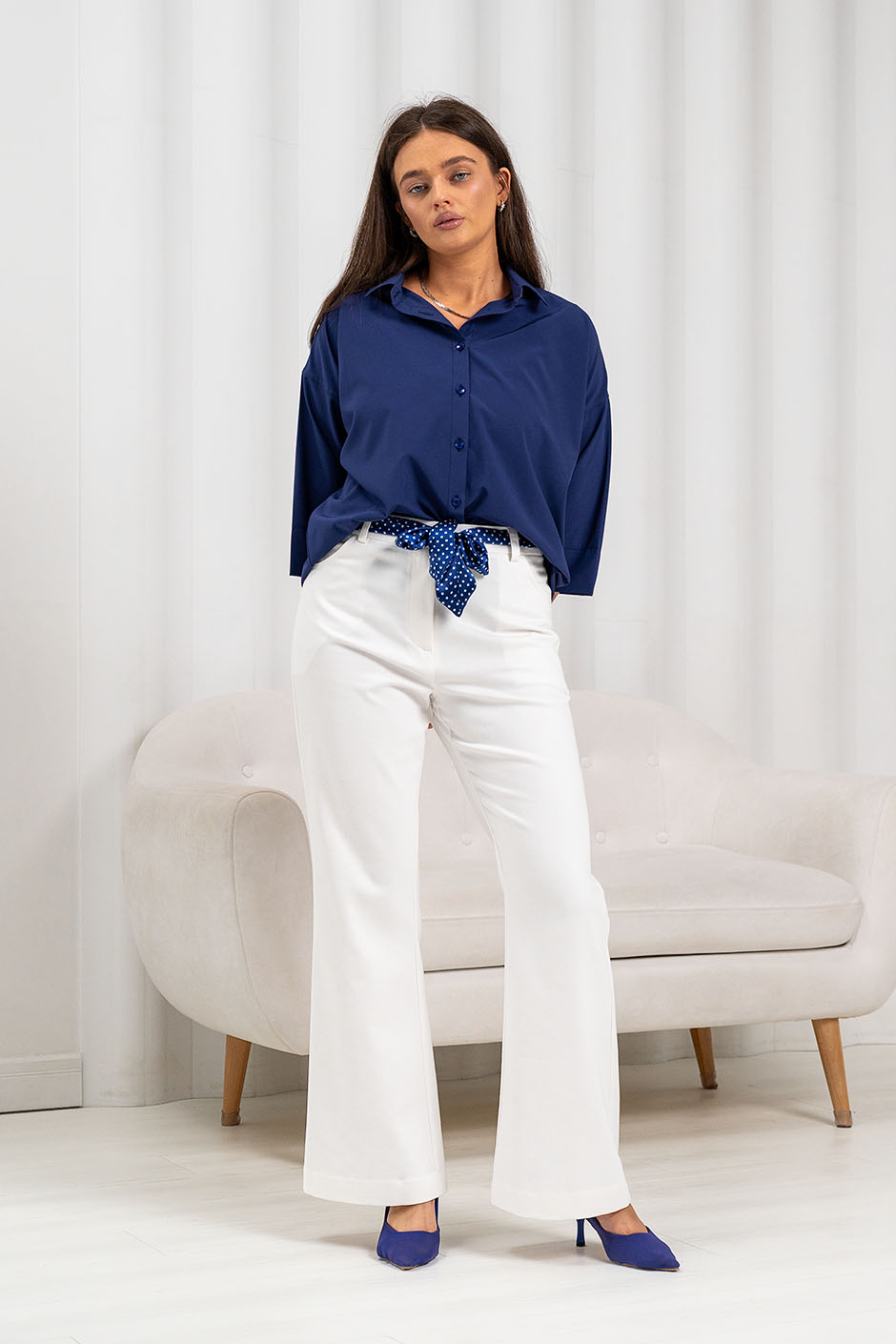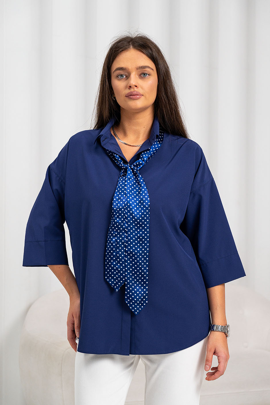 Ткань: блузочная.  Рубашка свободного покроя, спереди застежка на пуговицы, воротник на стойке, рукав цельнокроеный. Рукав длиной ¾. К рубашке прилагается галстук в горошек.Длина ок.72 см.