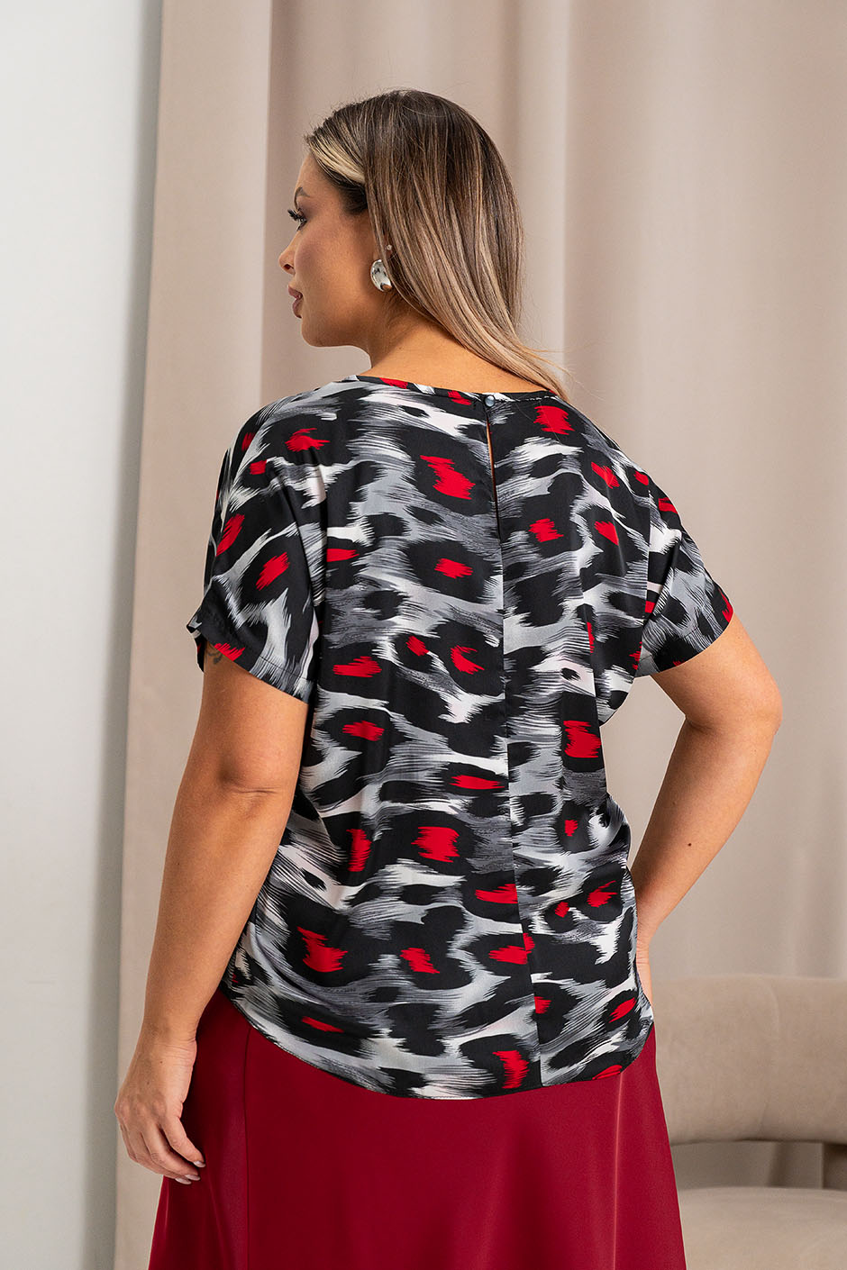 Ткань: искусственный шелк, набивной. Блуза простого свободного покроя, с цельнокроеным  рукавом. Рукав короткий. Длина ок. 60 см.