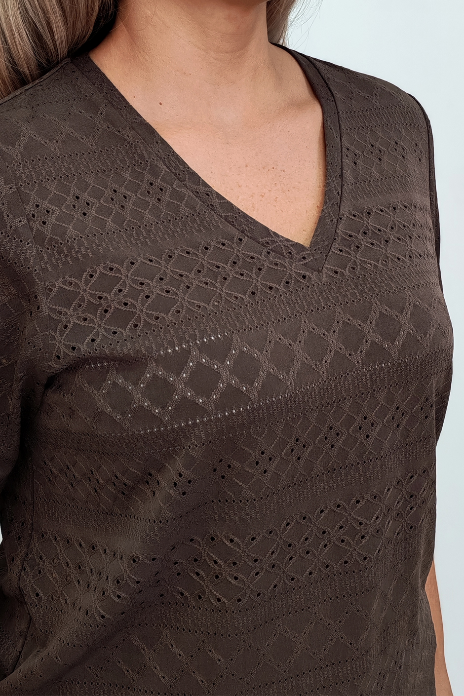 Ткань: трикотажное ажурное полотно. Блузка простого покроя, с V-образным вырезом, рукав втачной короткий. Длина изд.ок. 65 см.