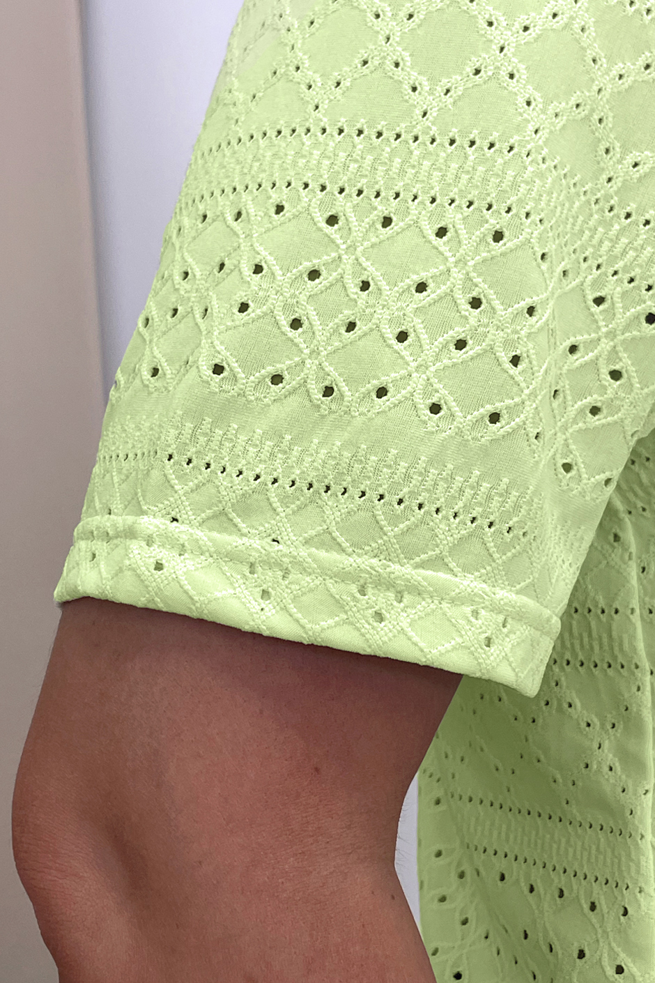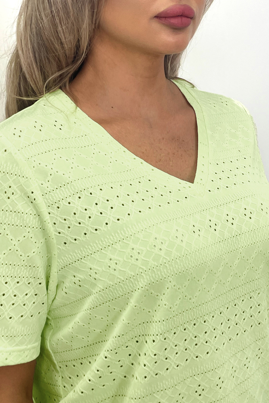 Ткань: трикотажное ажурное полотно. Блузка простого покроя, с V-образным вырезом, рукав втачной короткий. Длина изд.ок. 65 см.