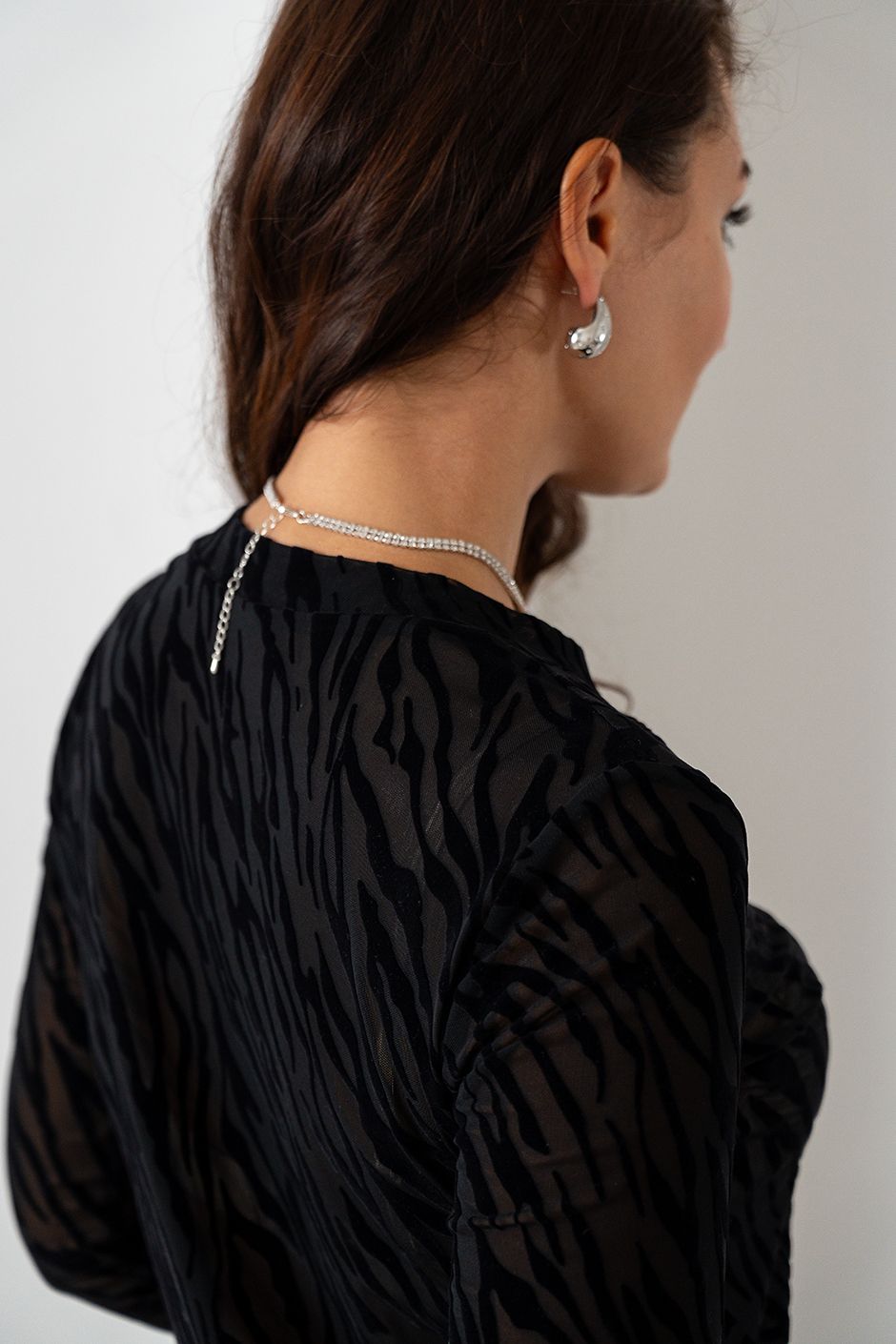 Ткань: сетка-бондинг бистрейч  "Зебра", черный. Лонгслив полуприлегающего покроя, с небольшим вырезом. Рукав длинный. Длина ок.64см
