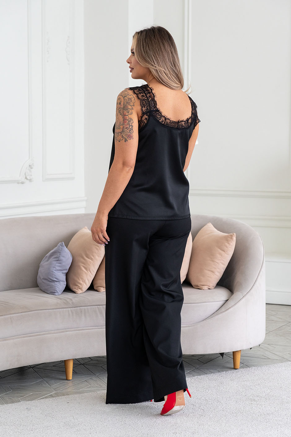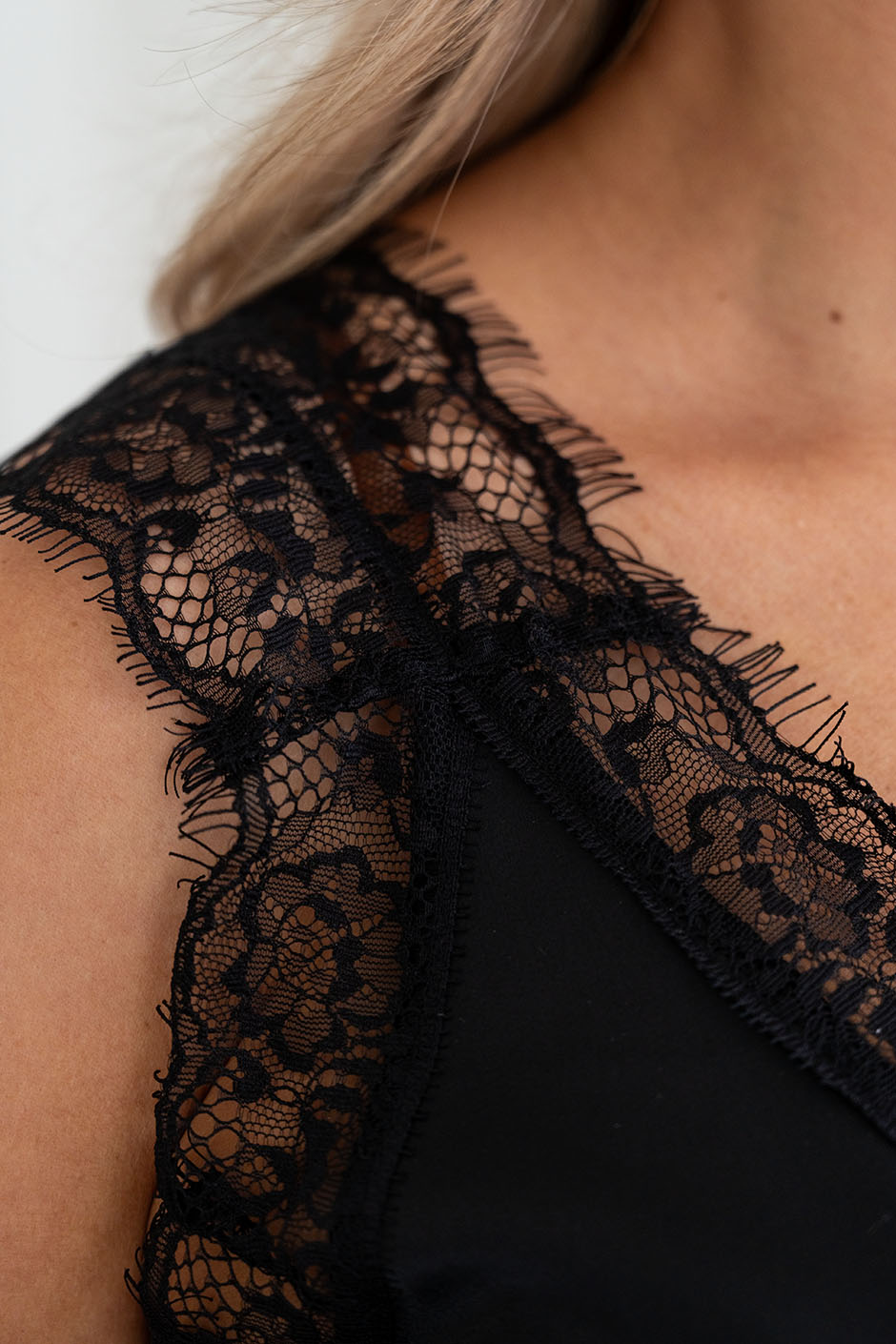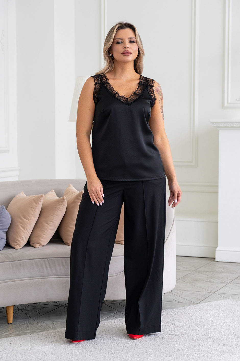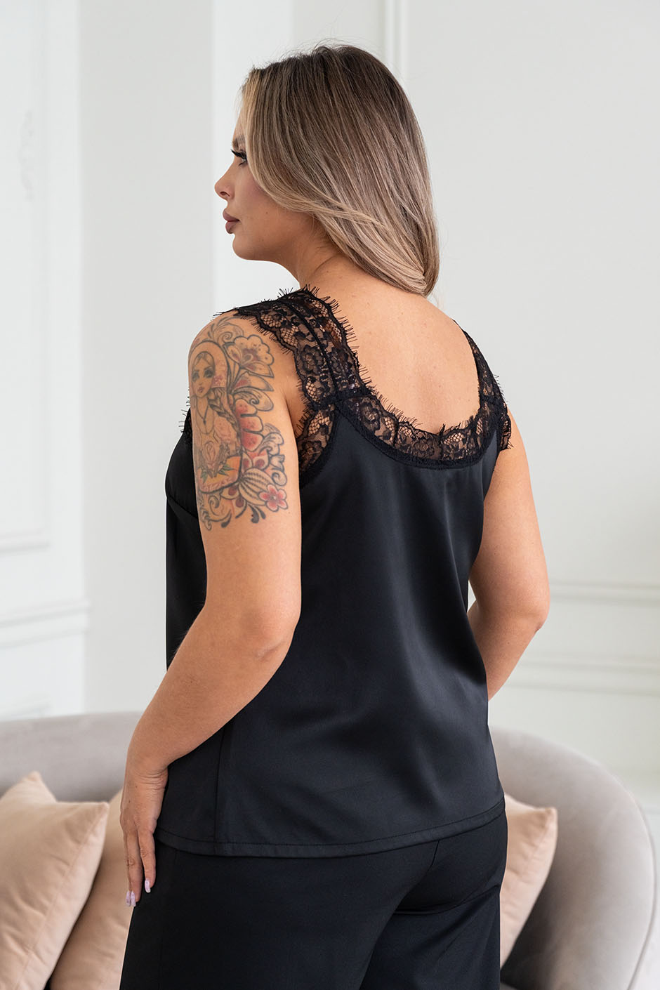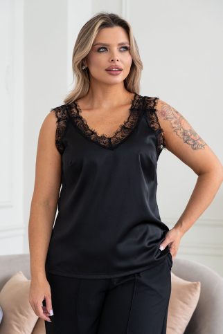 Ткань: искусственный шелк. Топ с  V-образным вырезом, по спинке-круглый, по груди вытачка, силуэт немного расширенный книзу. Отделка кружевом « Шантильи» по всей длине выреза и по пройме. Ширина кружева на лямках скрывает лямки от белья. Длина ок. 60 см.
