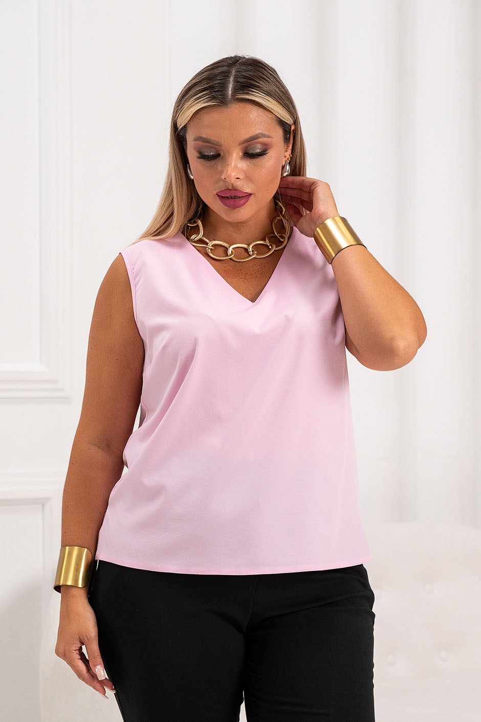 Ткань: блузочная. Топ простого покроя, с V-образным вырезом, без рукавов. Длина изд. ок.65см.