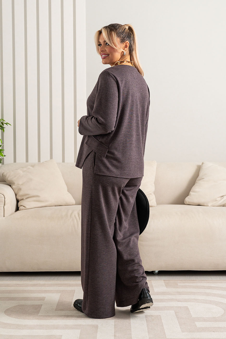 Ткань: трикотажное полотно меланж. Брюки «палаццо», высокая посадка, пояс на резине, в боковых швах – косые карманы. Длина по внутреннему шву ок. 80 см.