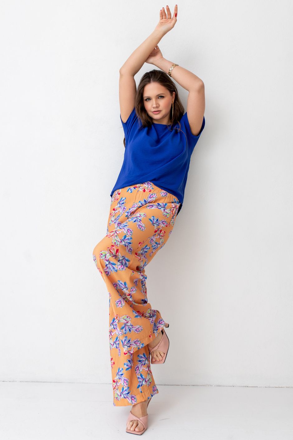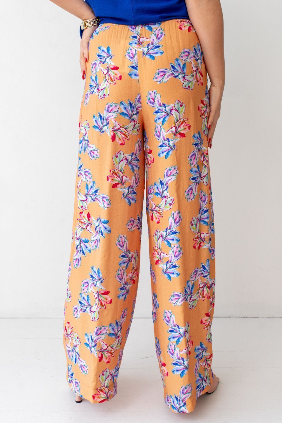 Ткань: хлопок. Брюки с высокой посадкой, пояс на резине, в боковых швах – косые карманы, книзу сильно расклешенные. Длина по внутреннему шву ок. 80 см.