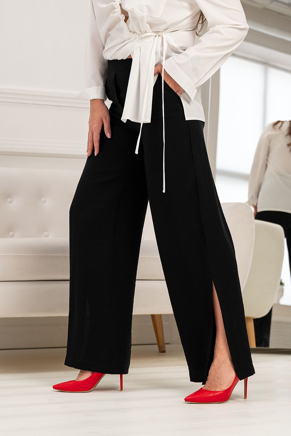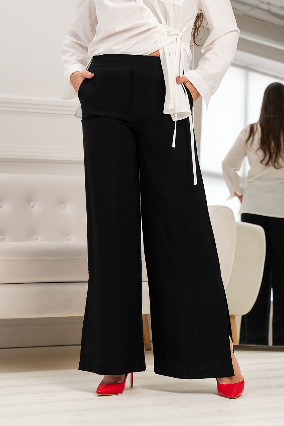 Ткань:вискоза креш. Брюки прямые, с высокой посадкой, в боковых швах – косые карманы, и разрезы. Длина по внутреннему шву ок.83см.