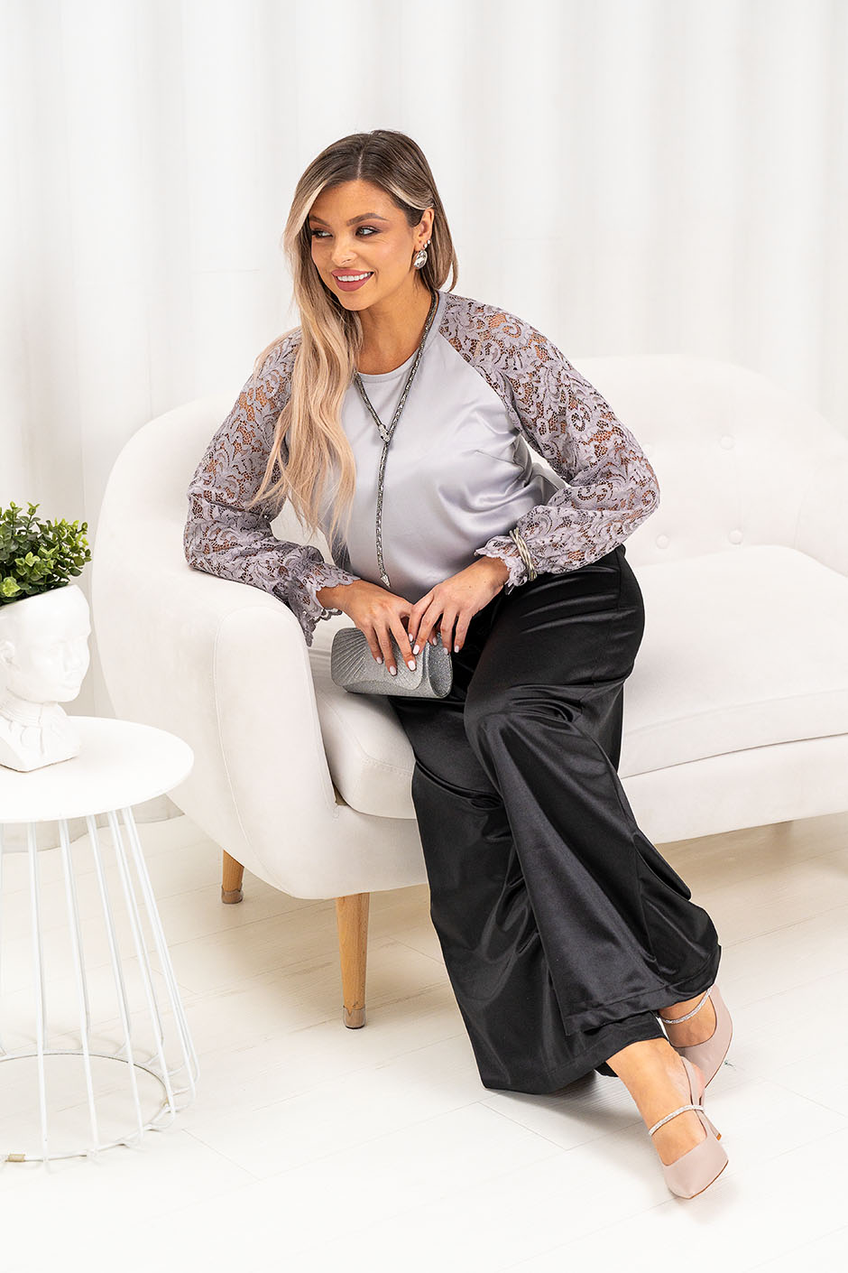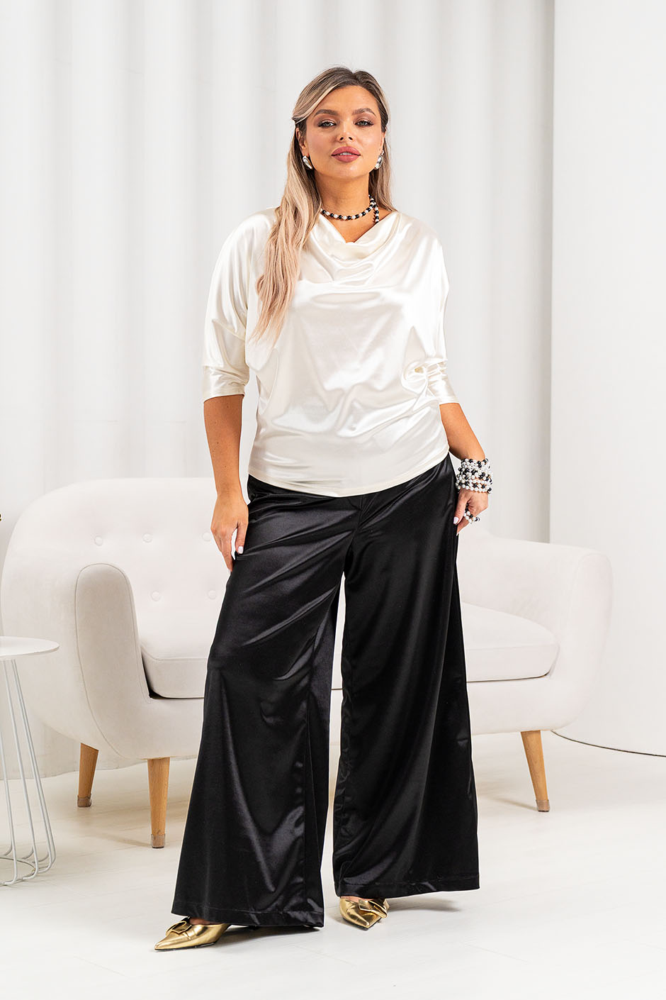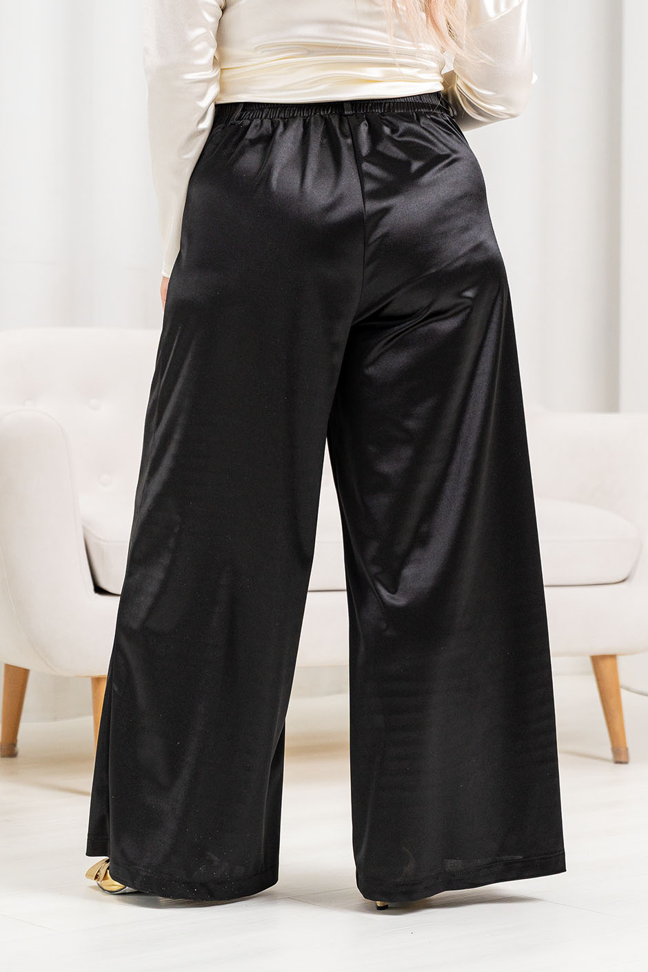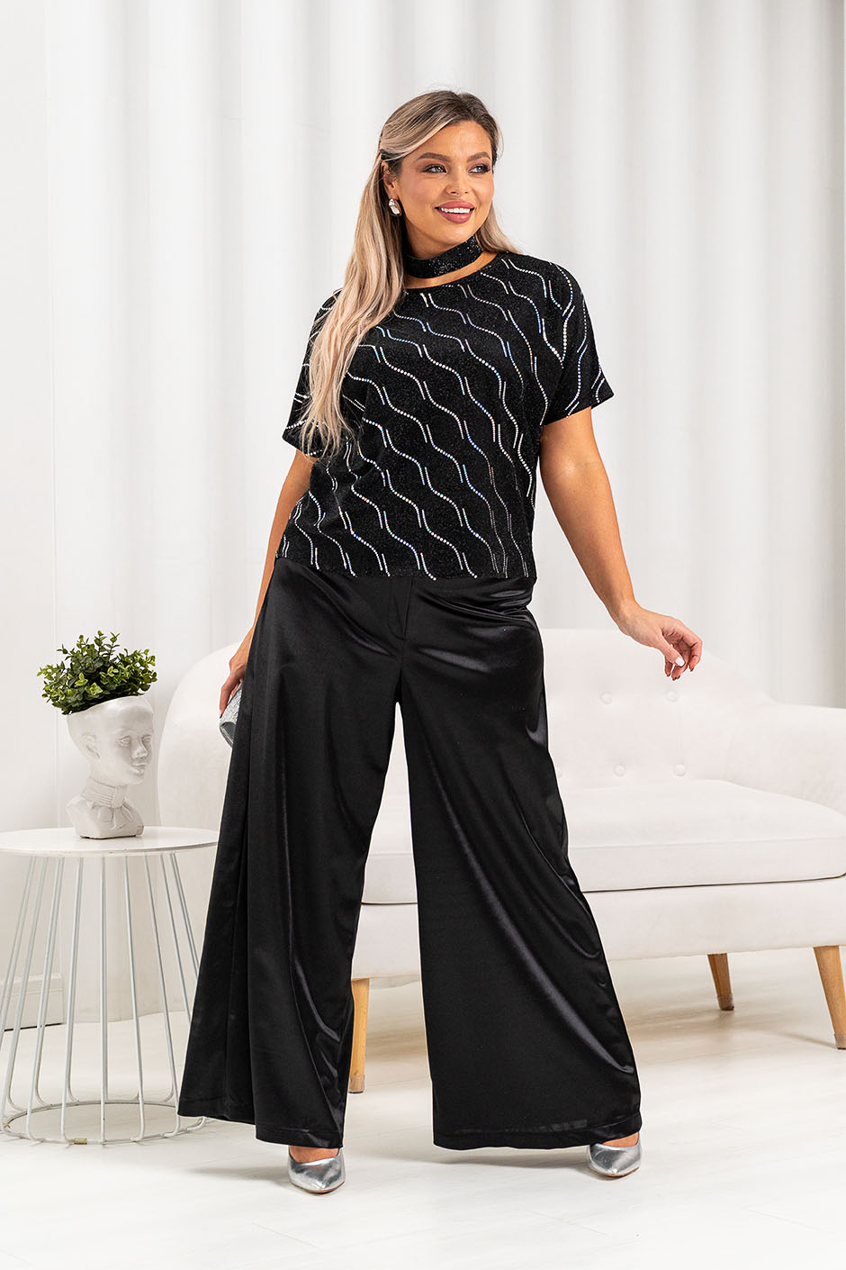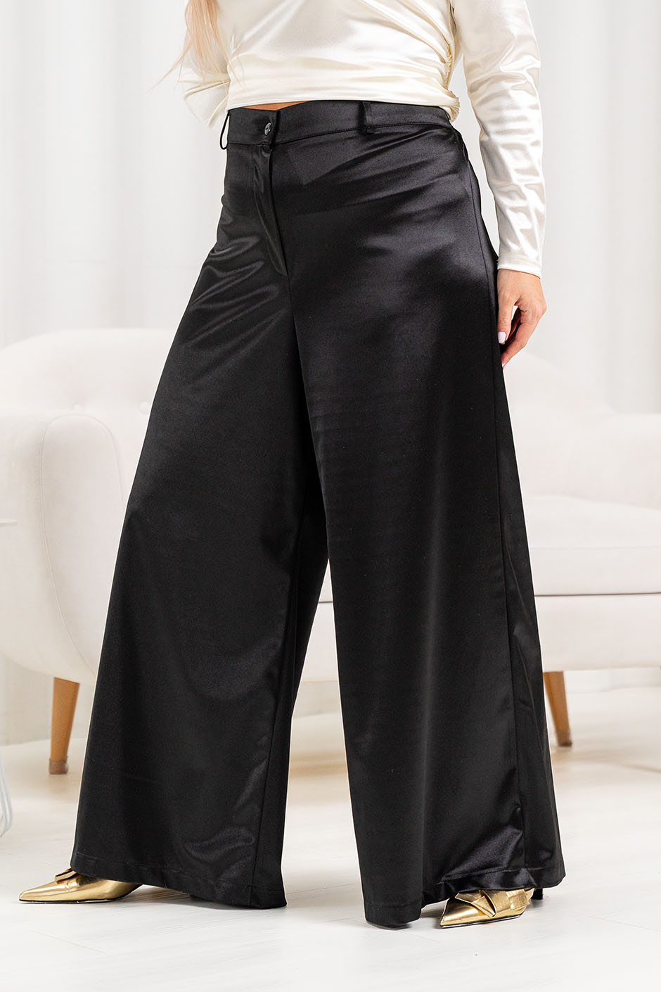 Ткань: сатин-нейлон.Нарядные брюки широкие, с высокой посадкой, спереди застежка на молнию, сзади на резинке. Длина брюк по внутреннему шву ок. 74см. ширина штанины ок. 43 см.