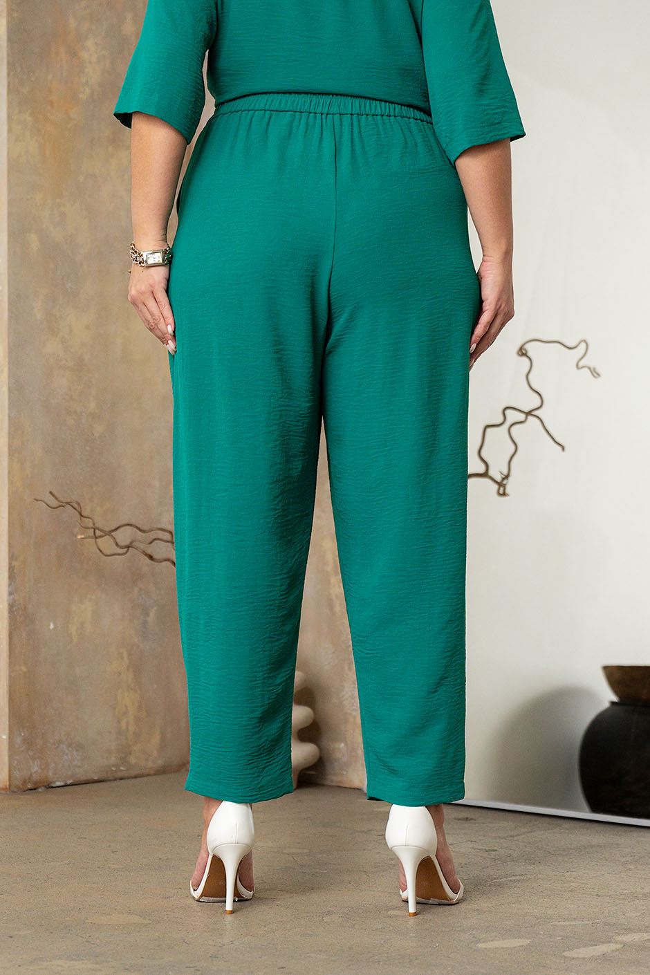 Ткань: вискоза с эффектом креш. Брюки-бочка с высокой посадкой, спереди пояс, застежка на молнию, сзади пояс на резине, в боковых швах косые карманы. Крой брюк в верхней части свободный, к низу зауженный. Длина брюк по внутреннему шву ок. 70см.