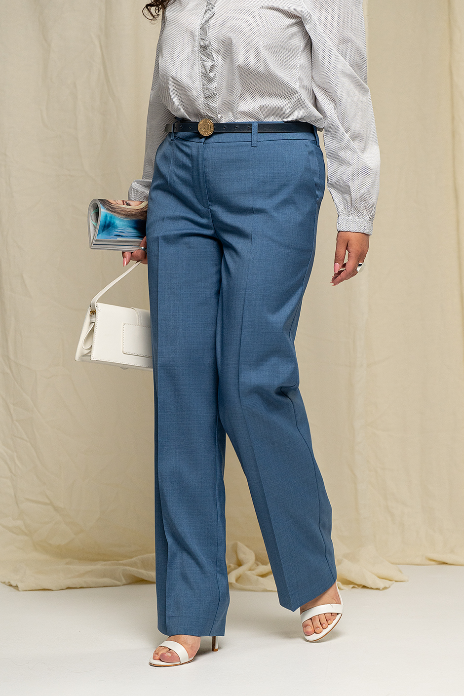 Ткань: полированный лен смесовый "Louis Vuitton". Брюки с широкими штанинами, с высокой посадкой, спереди застежка на молнию, в боковых швах косые карманы. Длина по внутреннему шву ок.84 см.