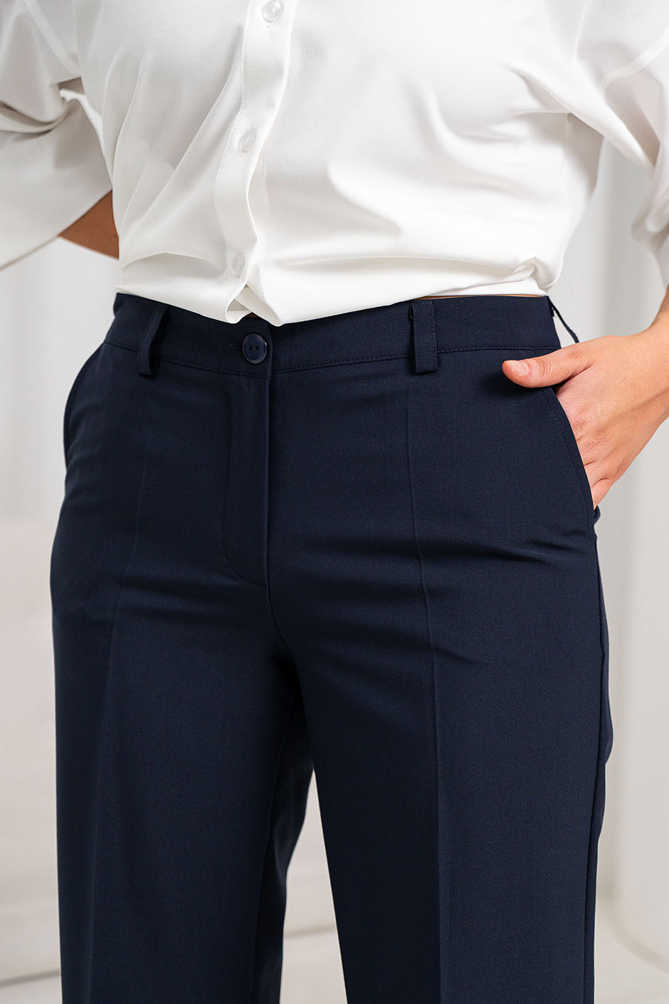 Ткань: костюмная однотонная. Брюки прямые, широкие,с высокой посадкой, спереди застежка на молнию, в боковых швах косые карманы, на поясе шлефки под ремень. Длина по внутреннему шву ок.86 см.