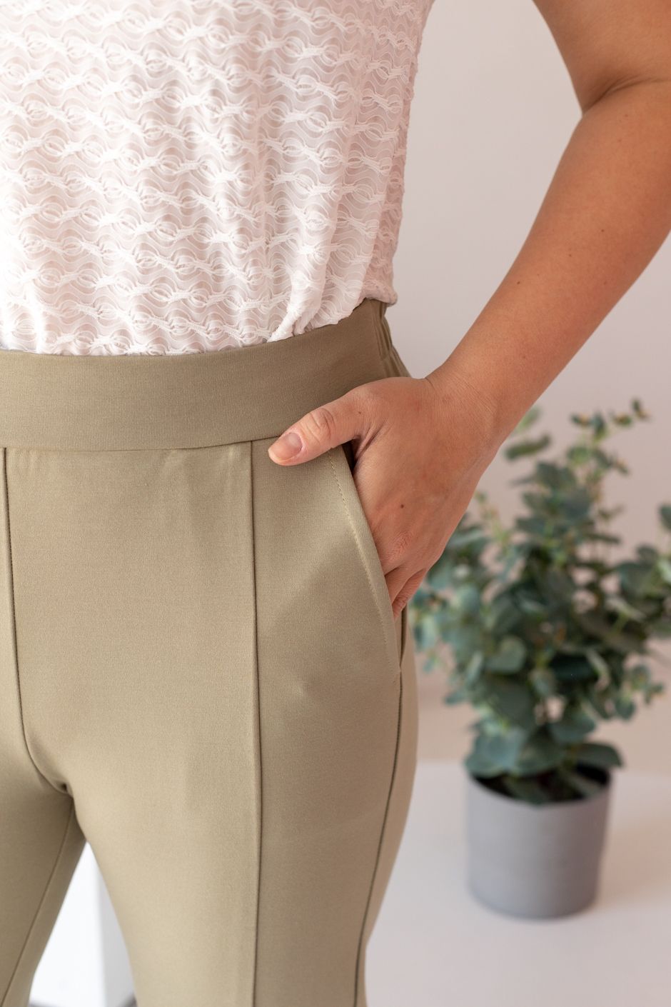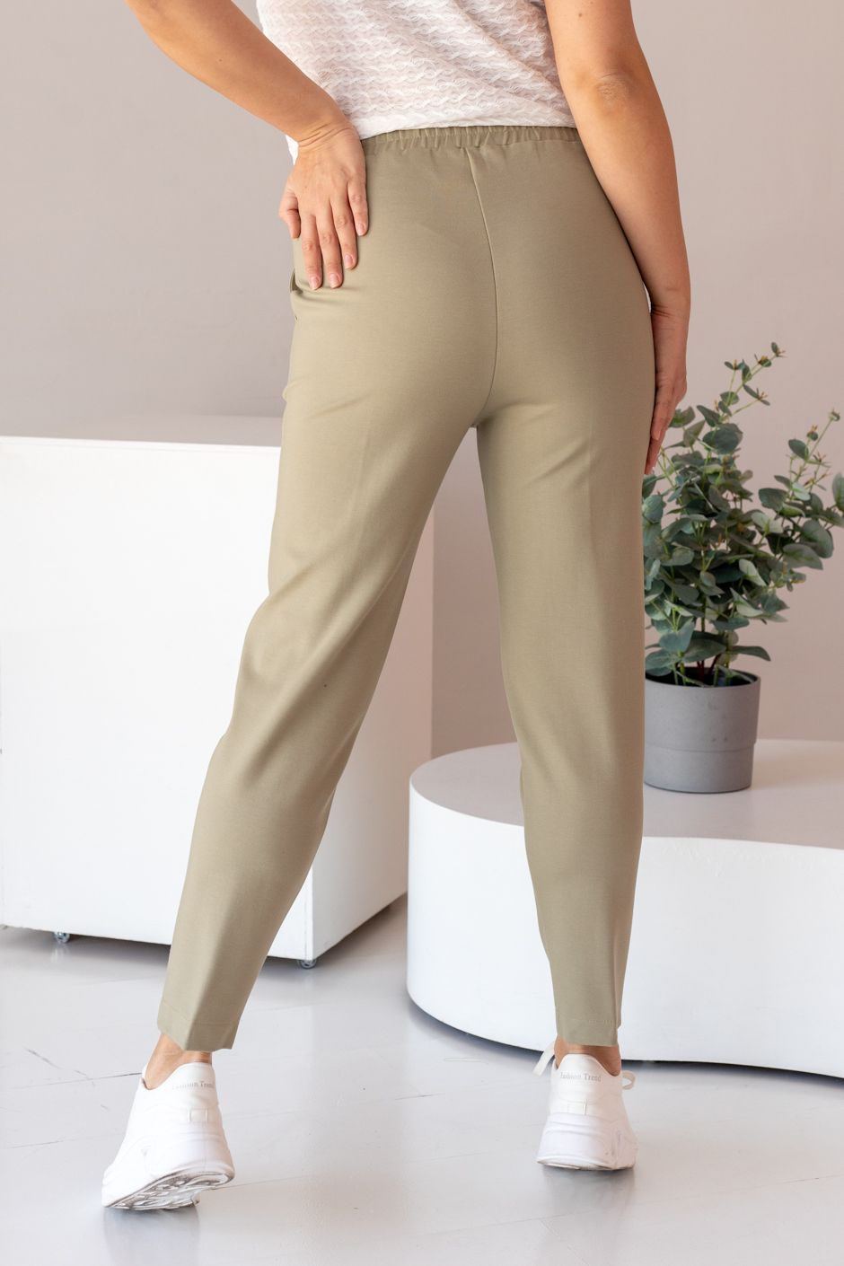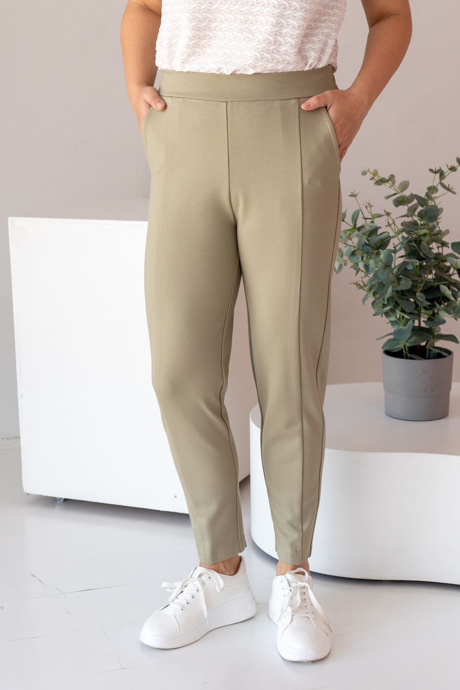 Ткань: трикотажное полотно «джерси» с высоким содержанием нейлона.  Брюки с высокой посадкой, спереди пояс-кокетка, в боковых швах – косые карманы. Длина по внутреннему шву ок.67 см.