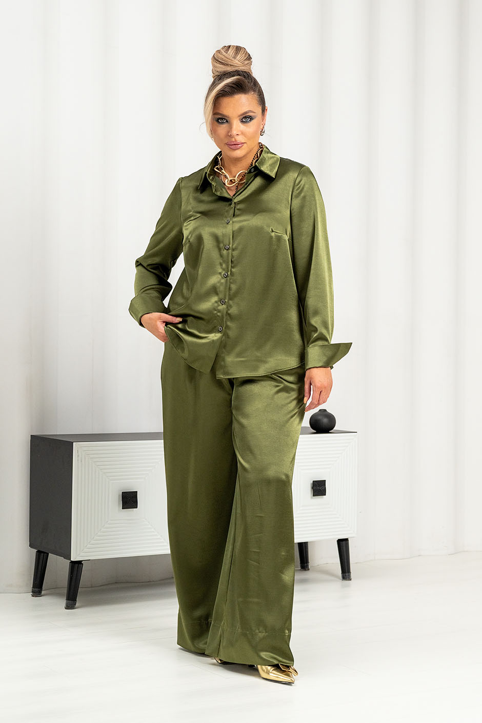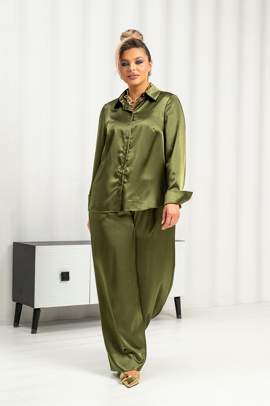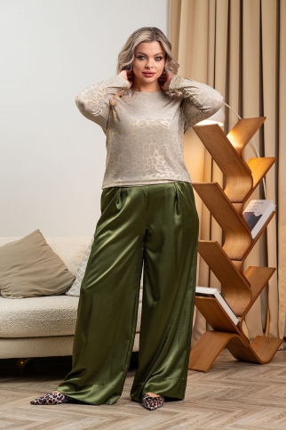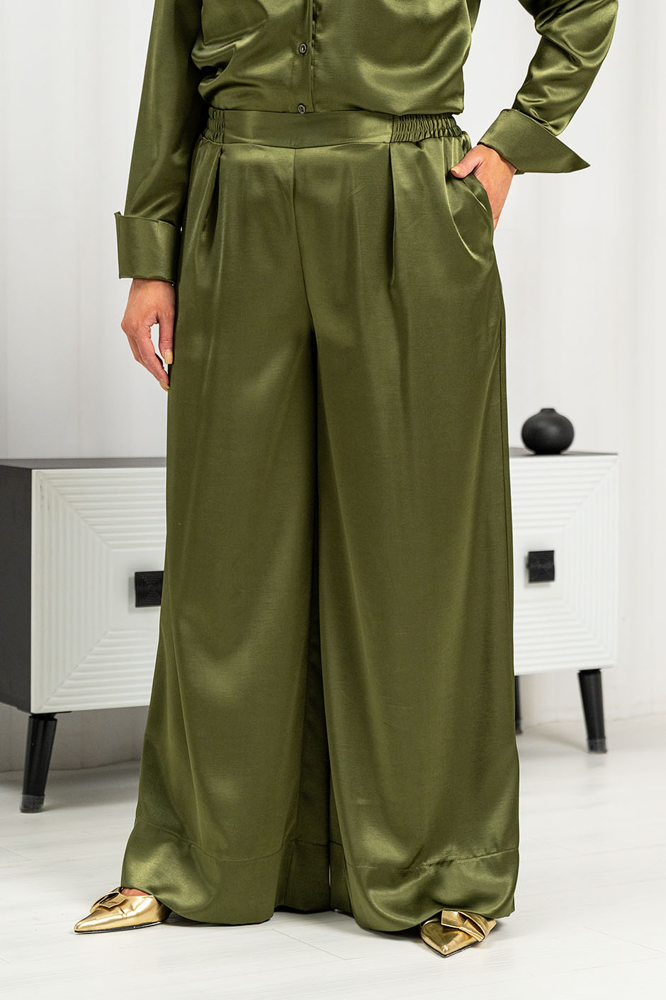 Ткань: шелк-сатин. Брюки с высокой посадкой, спереди пояс кокетка, и заложенная складка, сзади на резине, в боковых швах косые карманы. По низу изделия высокая подгибка. Ширина брючины  38см. Длина изд. по внутреннему шву ок.78см.