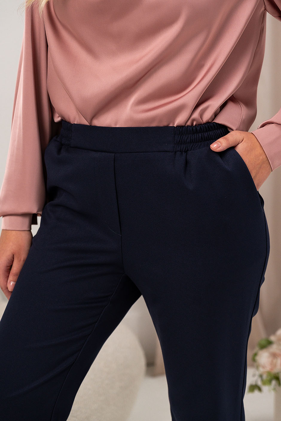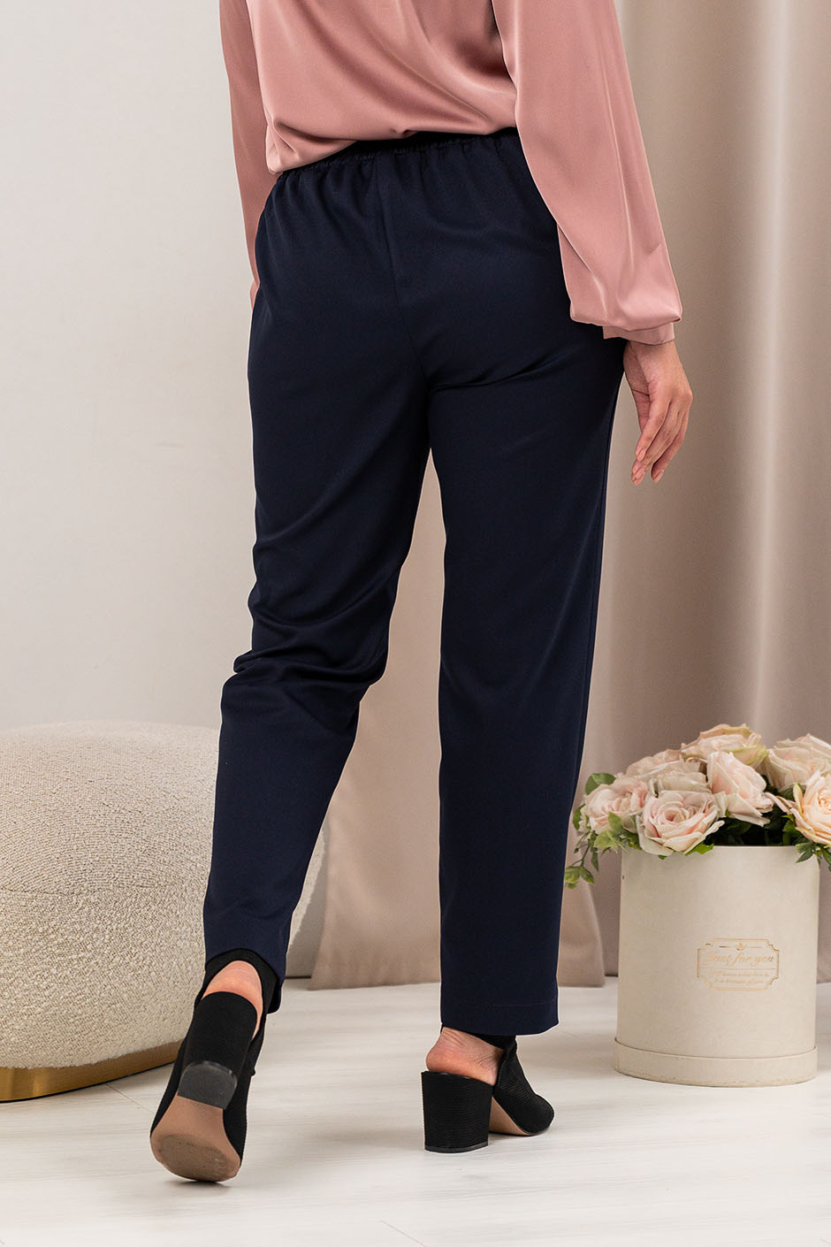 Ткань: костюмная однотонная.Брюки с высокой посадкой, спереди – пояс кокетка, сзади на резине, в боковых швах – косые карманы. Длина по внутреннему шву ок. 72 см.