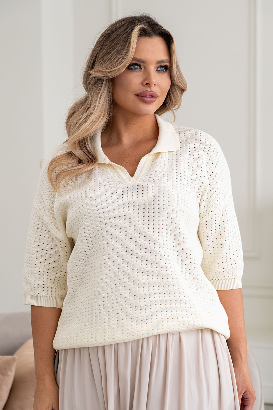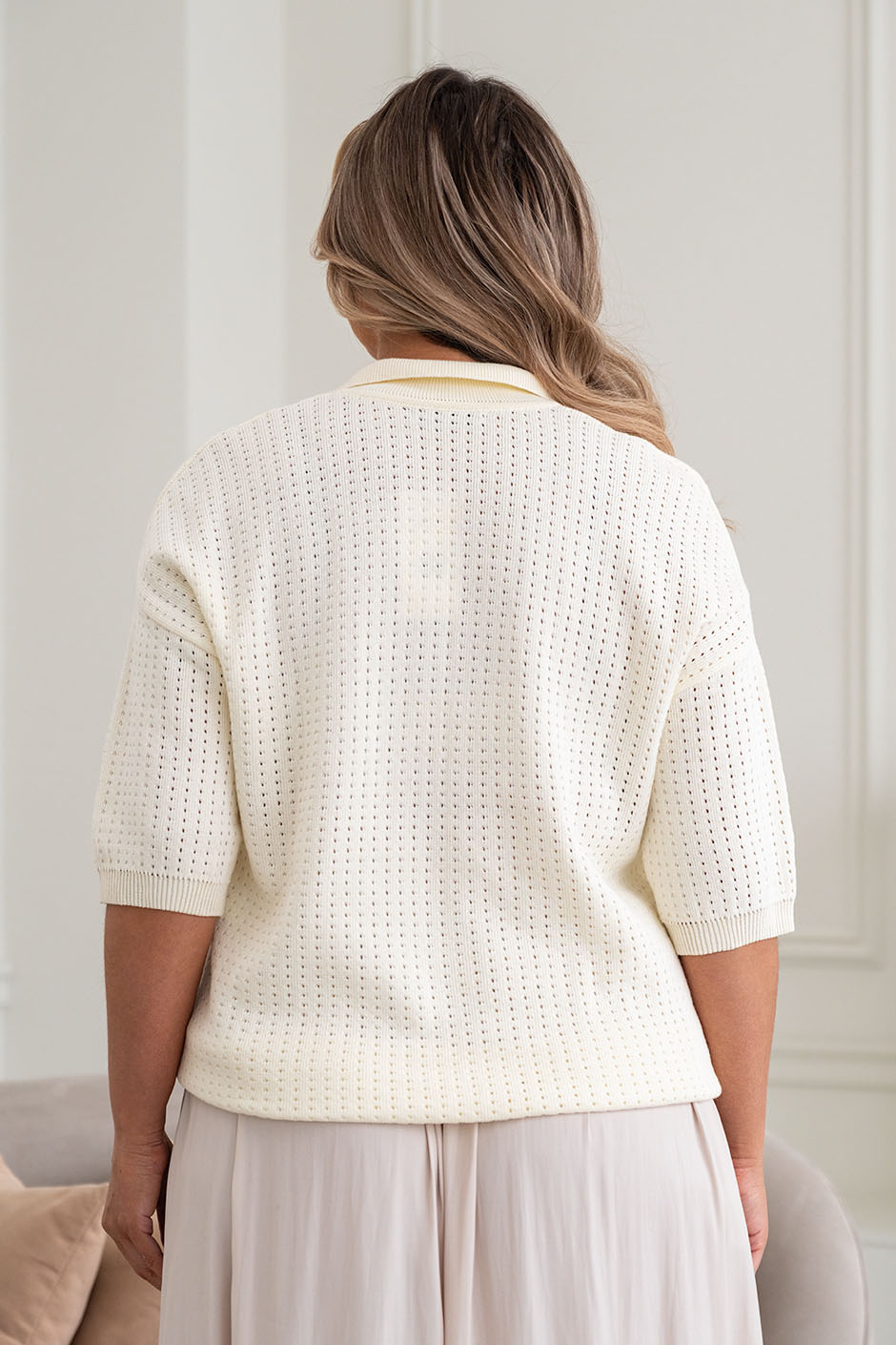 Ткань: вязанный трикотаж. Джемпер-поло, короткий рукав. Длина изд.ок. 65 см.