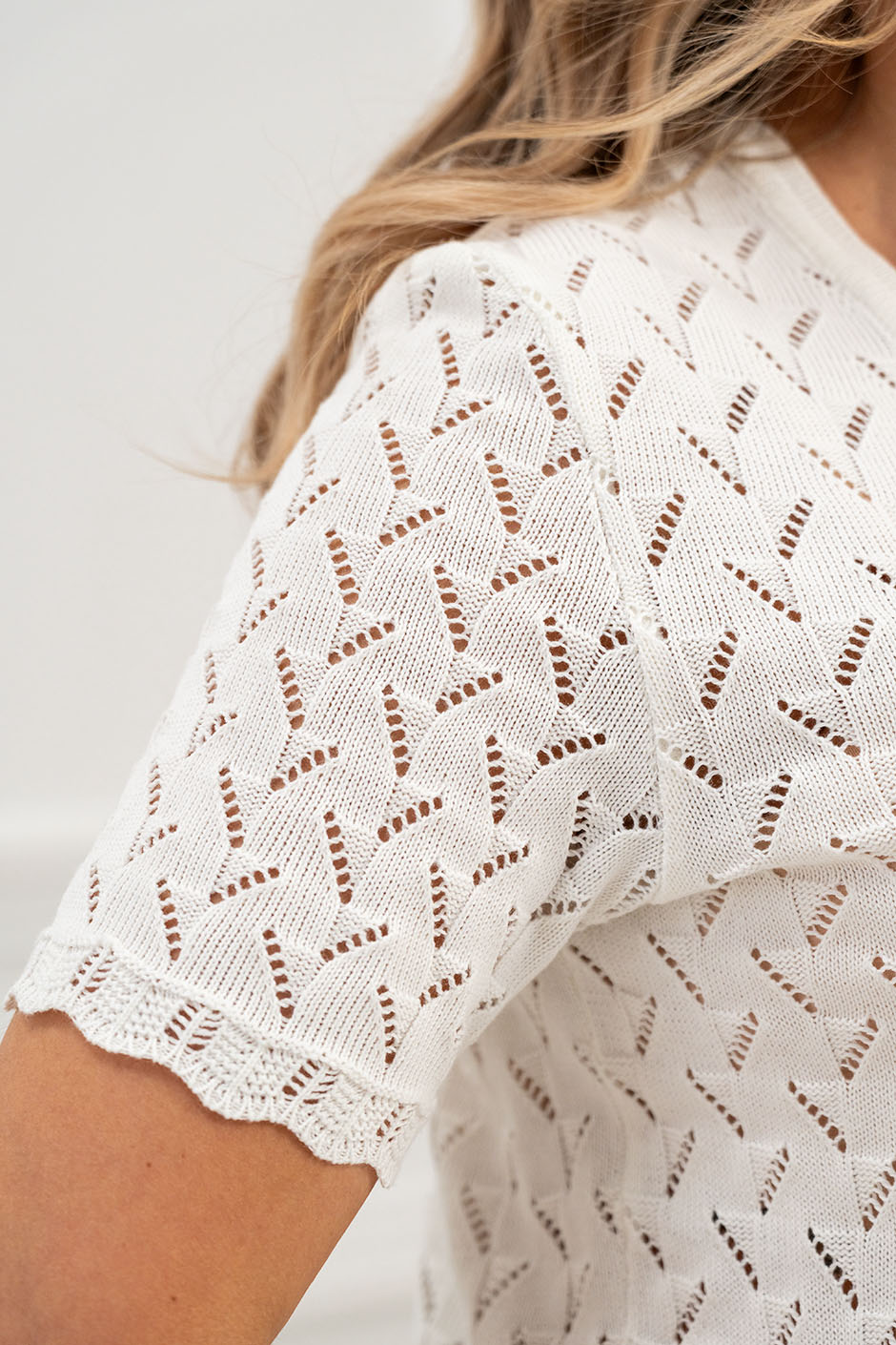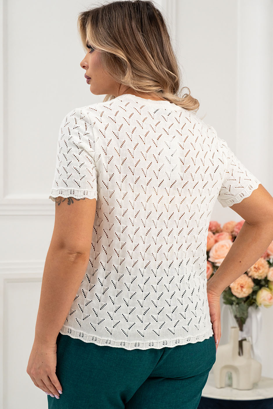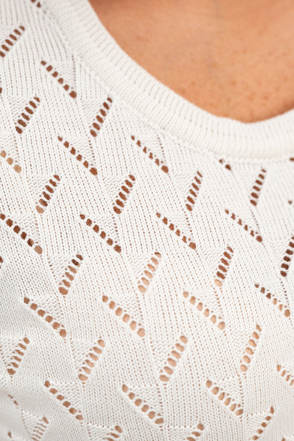 Ткань: хлопковое трикотажное полотно ажурной вязки. Джемпер простого покроя, с круглым вырезом. Рукав короткий. Длина изд. ок. 60см.