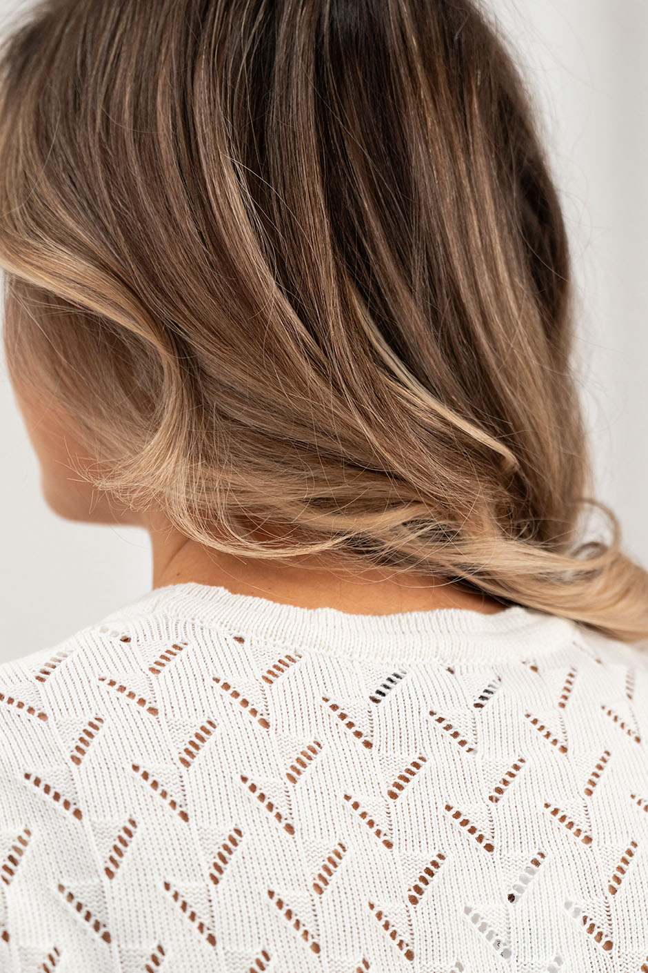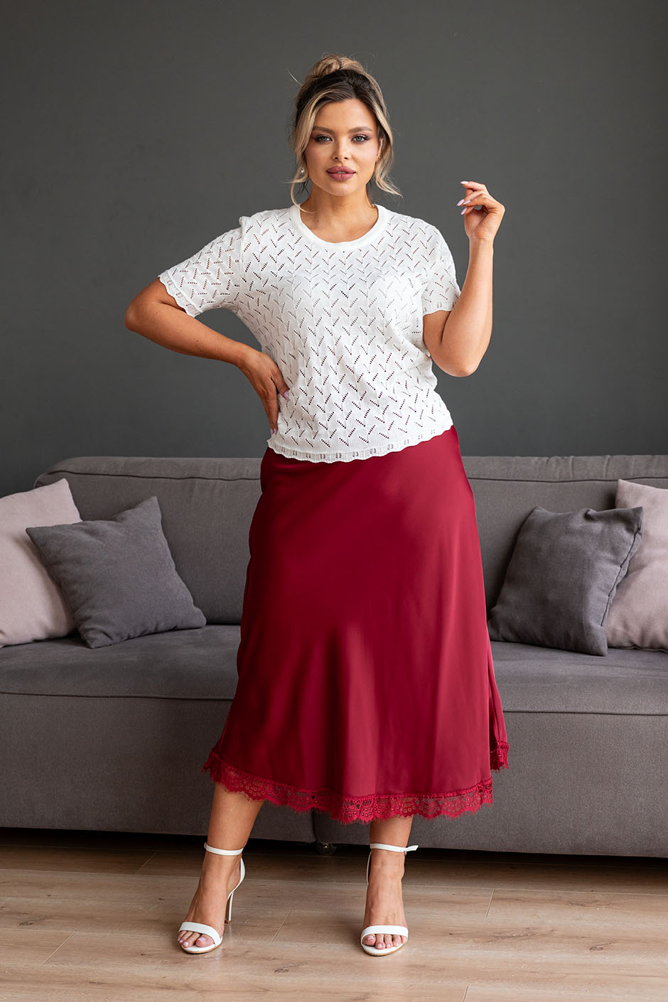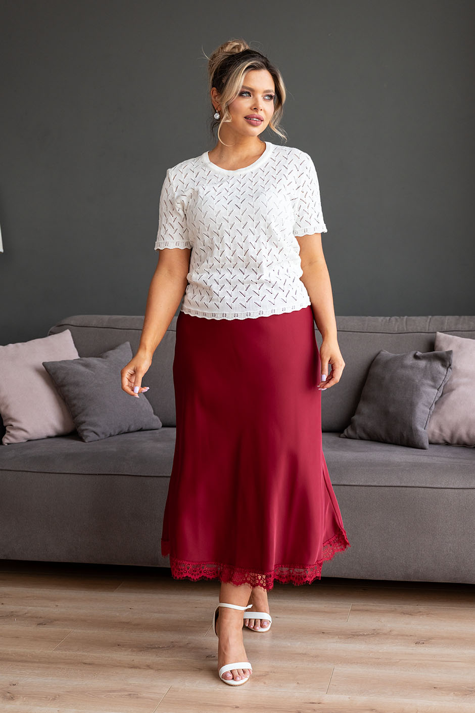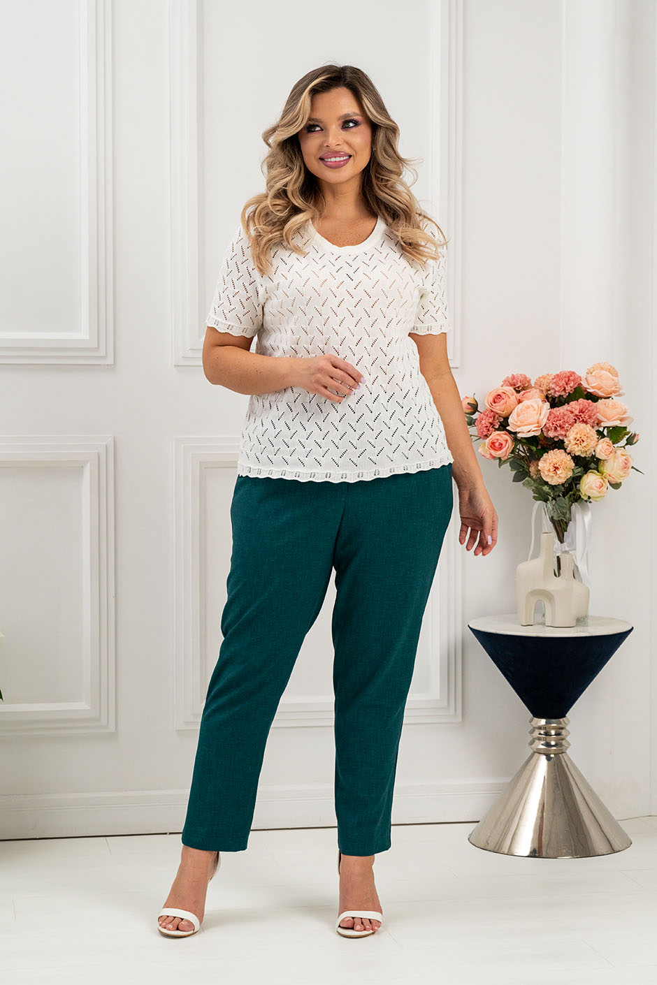 Ткань: хлопковое трикотажное полотно ажурной вязки. Джемпер простого покроя, с круглым вырезом. Рукав короткий. Длина изд. ок. 60см.
