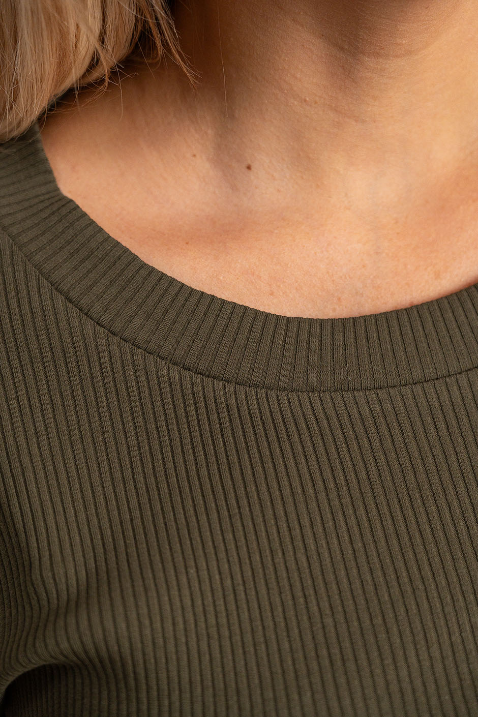 Ткань: трикотажное полотно с выработкой в резинку. Лонгслив полуприлегающего покроя, с небольшим вырезом. Рукав длинный. Длина ок.64см