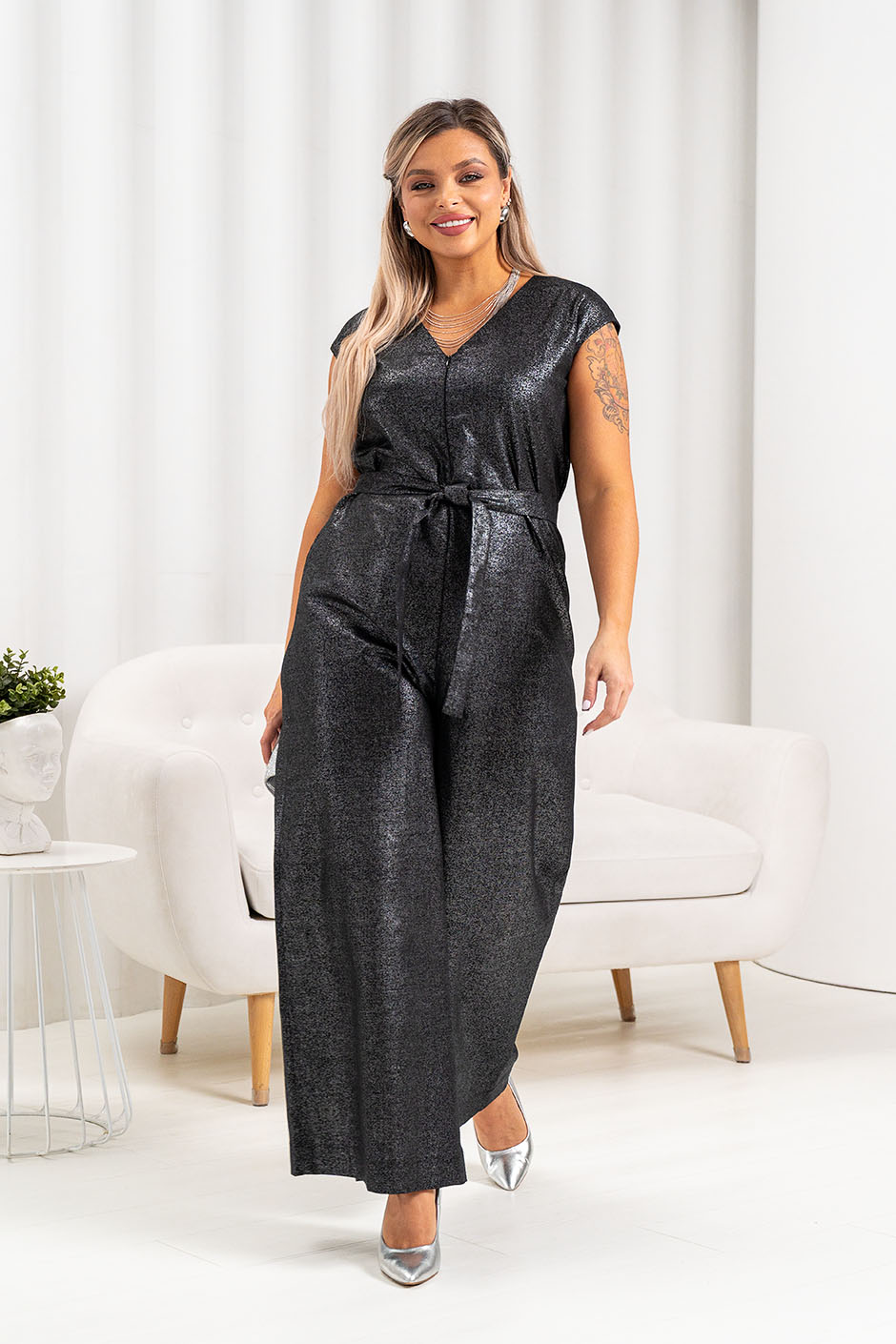 Ткань: костюмная с накатом. Комбинезон очень свободного покроя, вырез V-образный, спереди по шву потайной замок, рукав спущенный, очень широкие брючины, (ок.46см ). Длина по внутреннему шву ок. 72 см.К комбинезону прилагается пояс.  Длина изделия ок.158см.