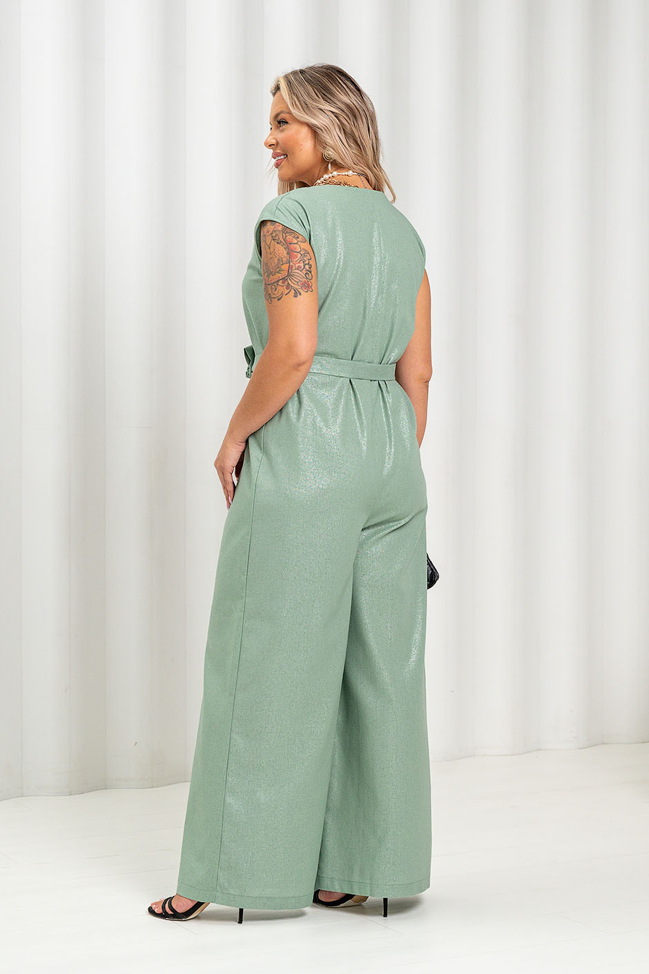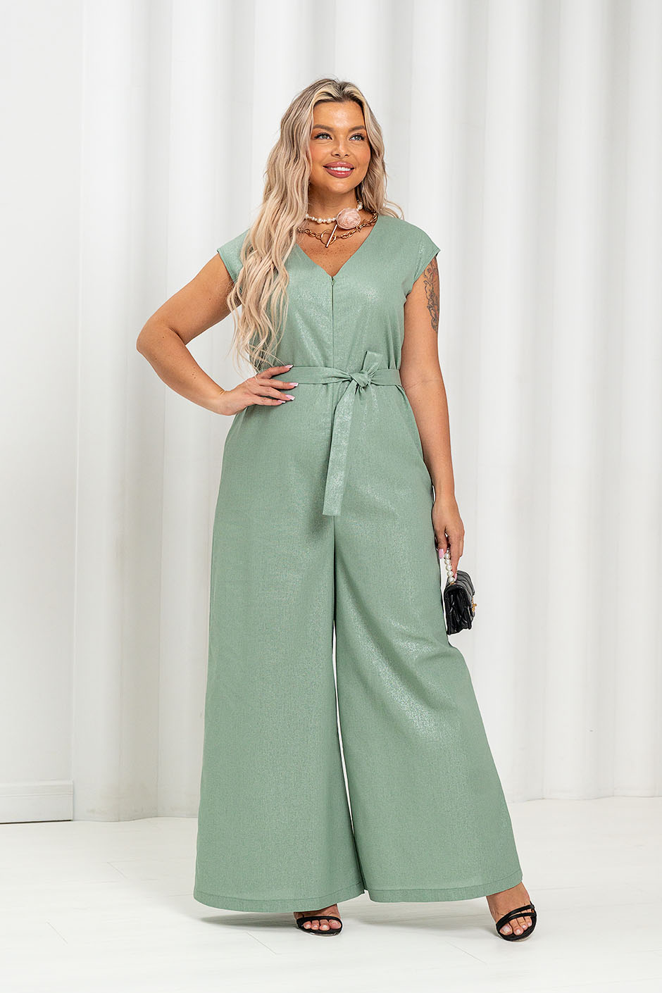 Ткань: костюмная с накатом. Комбинезон очень свободного покроя, вырез V-образный, спереди по шву потайной замок, рукав спущенный, очень широкие брючины, (ок.46см ). Длина по внутреннему шву ок. 72 см.К комбинезону прилагается пояс.  Длина изделия ок.158см.
