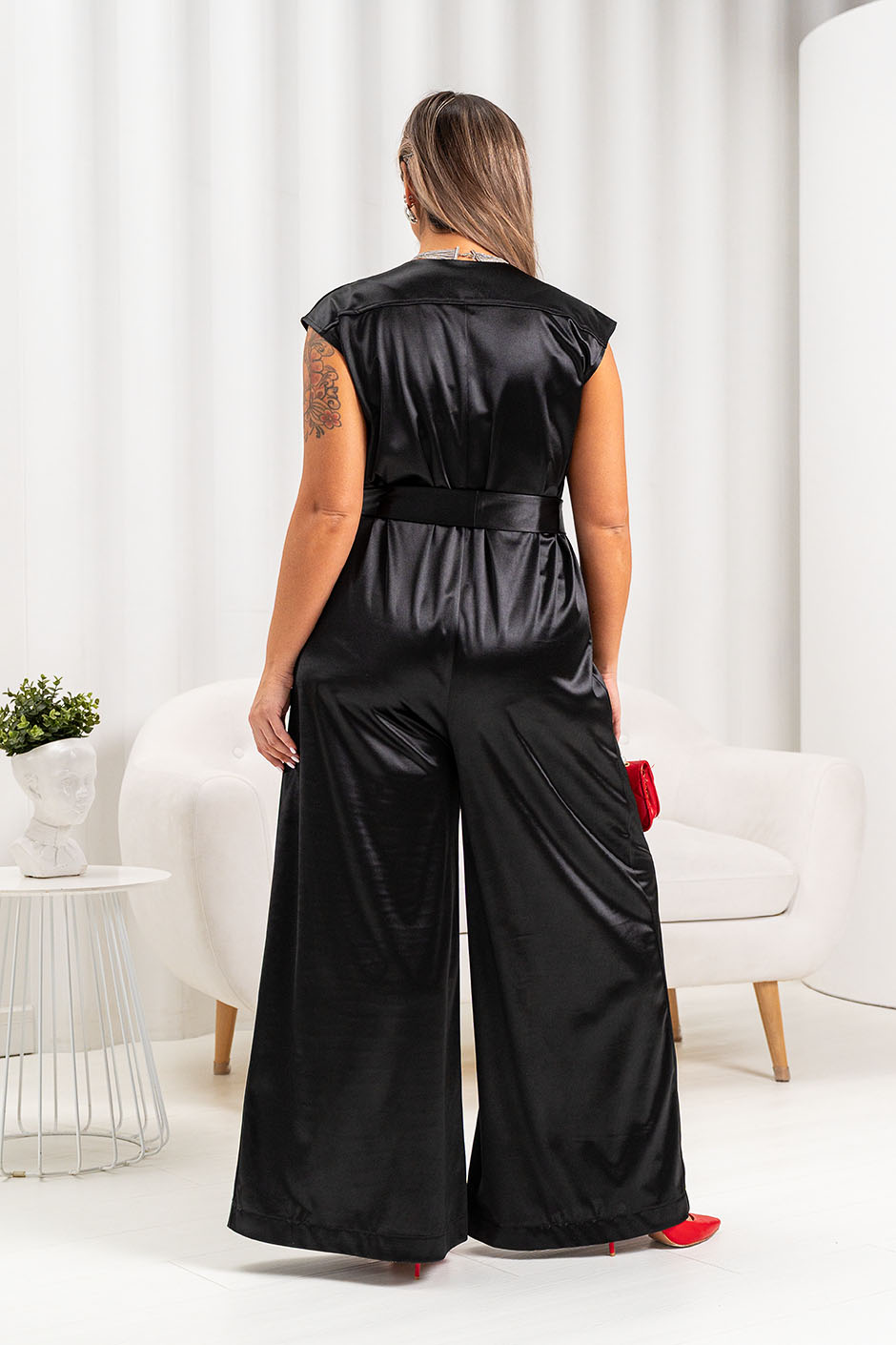 Ткань: сатин-нейлон. Комбинезон очень свободного покроя, вырез V-образный, спереди по шву потайной замок, рукав спущенный, очень широкие брючины, (ок.46см ). Длина по внутреннему шву ок. 72 см.К комбинезону прилагается пояс.  Длина изделия ок.158см.