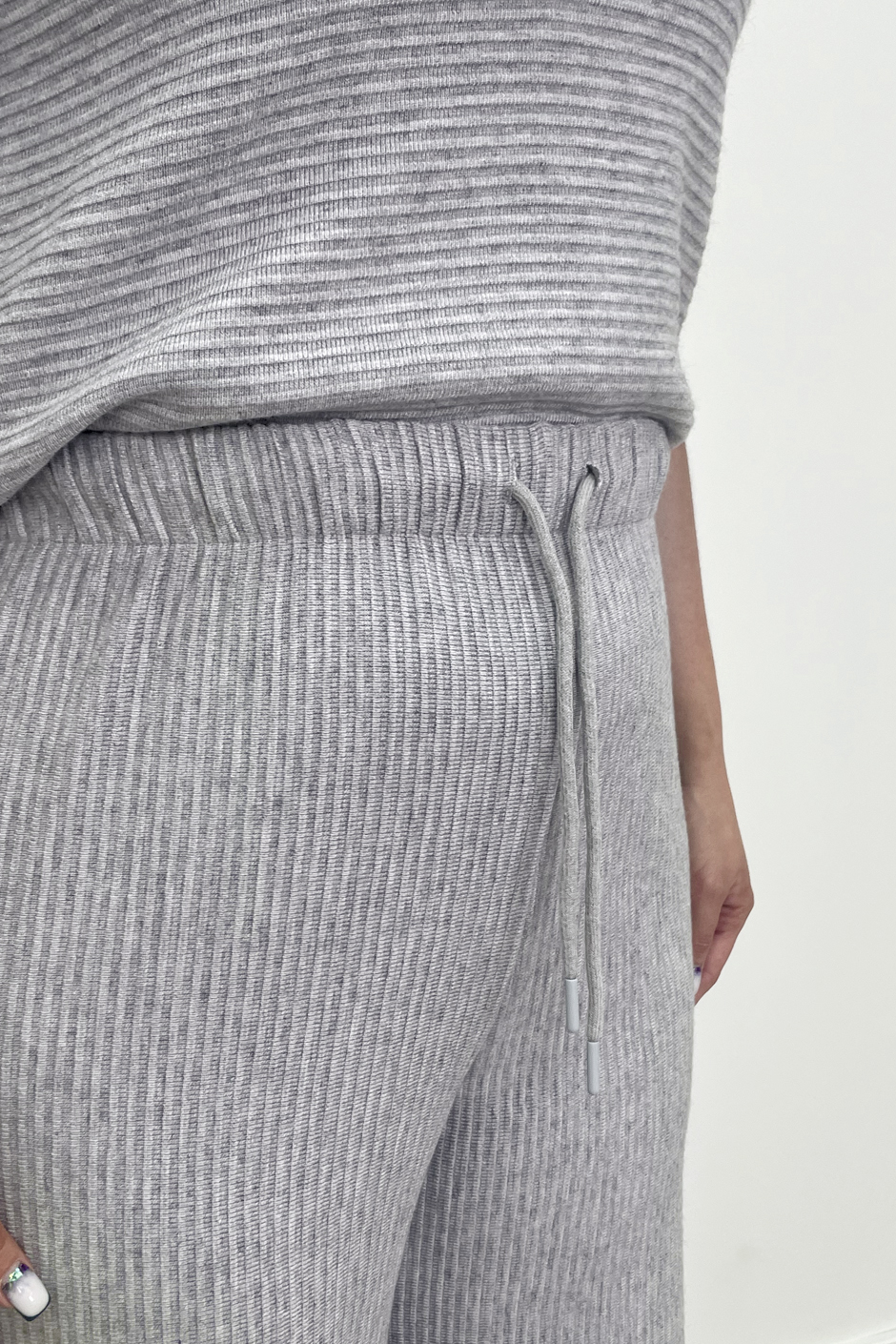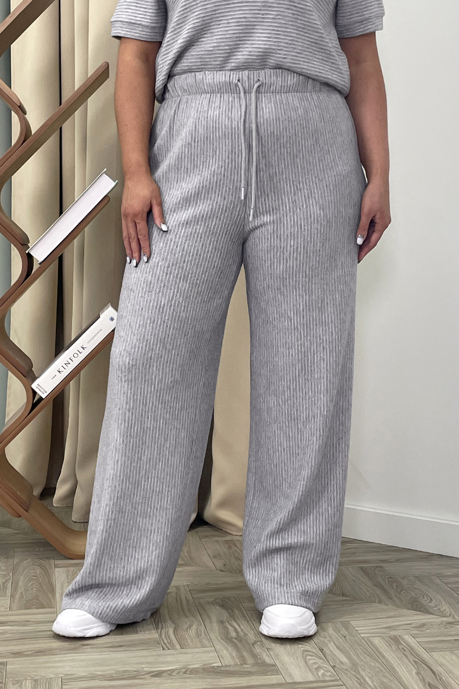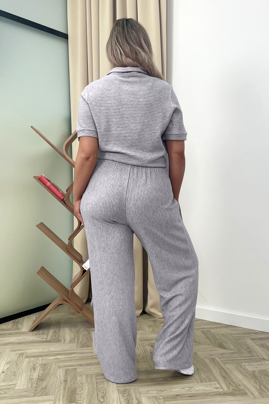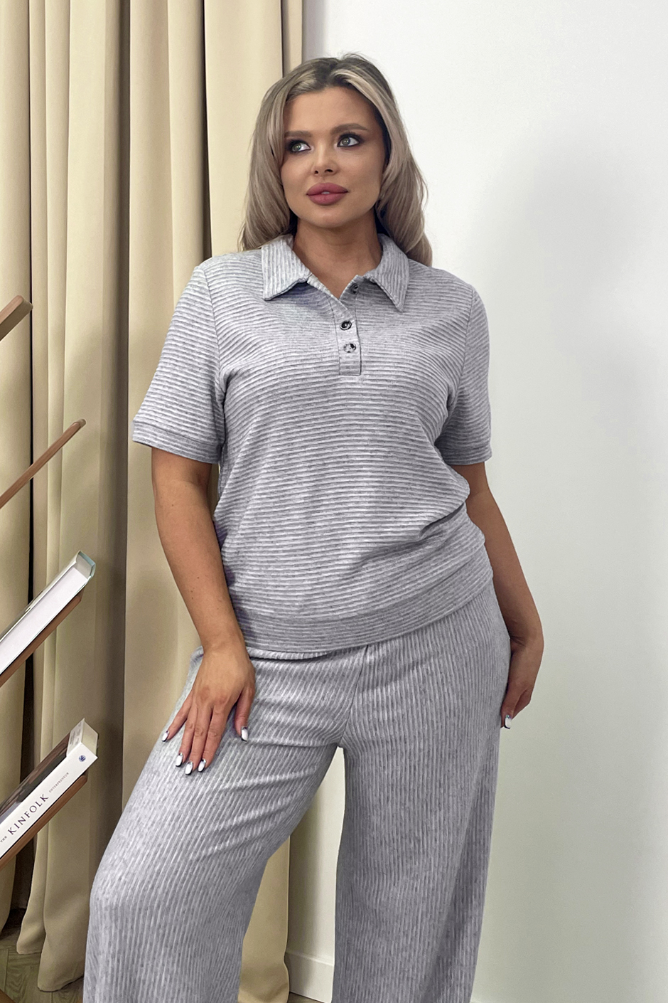 Ткань: вискозное трикотажное полотоно с выработкой в резинку. Джемпер-поло на застежке спереди, по низу изделия и рукаве манжет. Рукав короткий. Длина изд.ок. 65см. Брюки покроя палаццо, на резине, высокая посадка. Длина по внутреннему шву ок.82см.