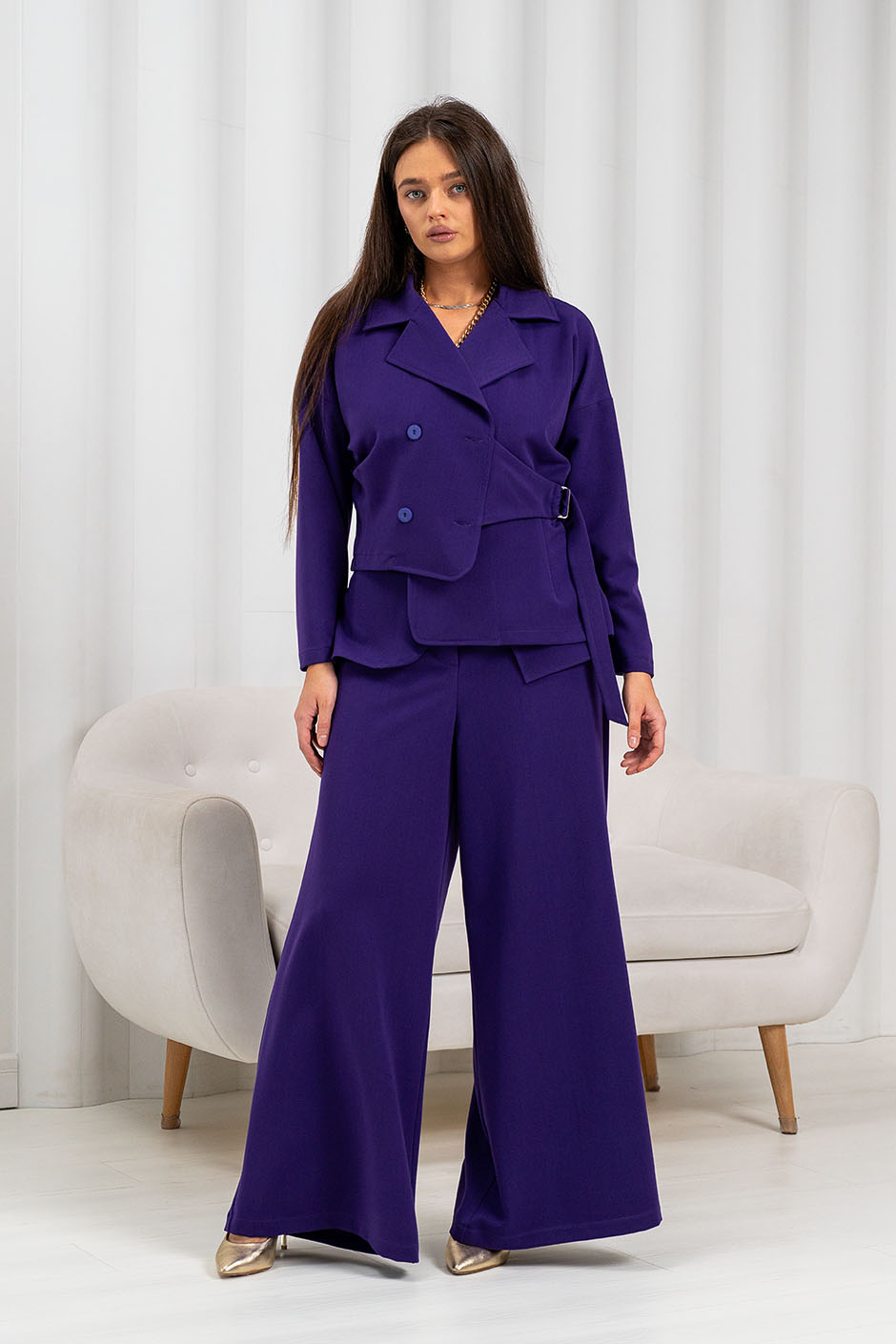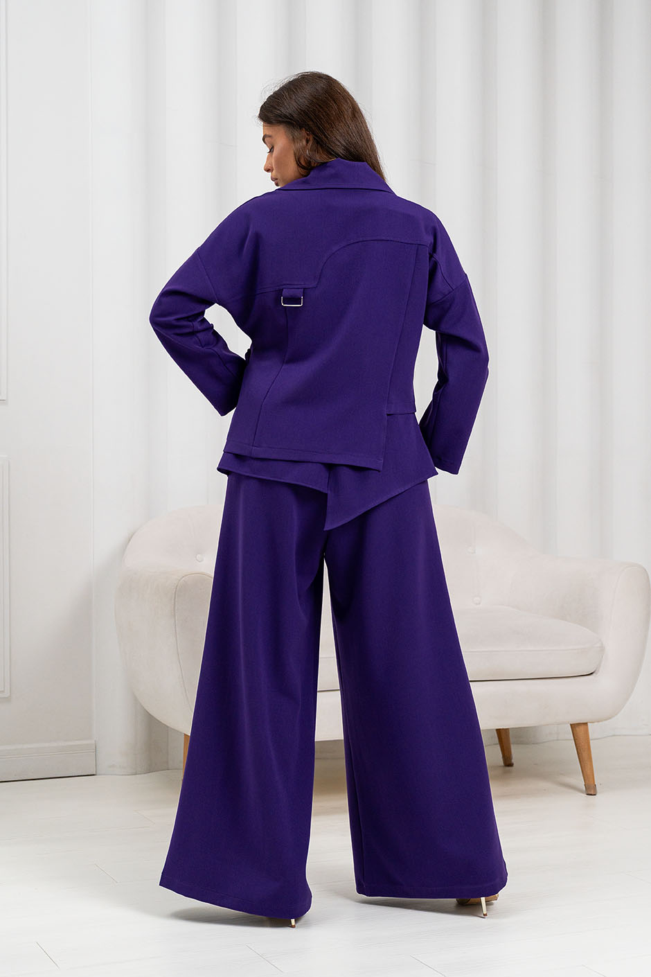 Ткань: костюмная. Костюм состоит из жакета и брюк. Жакет с английским воротником, ассиметричного кроя, двубортный, с дополнительной декоративной застежкой в области талии на пояс с пряжкой, линия плеча немного занижена, по спинке ассиметричная кокетка. Рукав длинный.длина от 48см до 58см ( в комплекте с брюками выглядит как полноценная длина). Брюки-палаццо, с высокой посадкой, спереди застежка на молнию, сзади на резинке, от линии талии идет втачная баска спереди и сзади, с разновеликой длины с декоративными украшениями. Длина брюк по внутреннему шву ок. 74см. ширина штанины ок. 43 см.