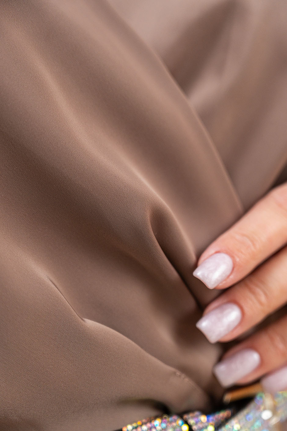 Ткань: полированный шелк, однотонный. Платье с цельнокроеным рукавом, спереди вырез запах, под грудью на резине, от линии талии юбка расклешенная, в боковых швах карманы. Рукав 3/4 с отворотом. Длина изделия ок.126 см.