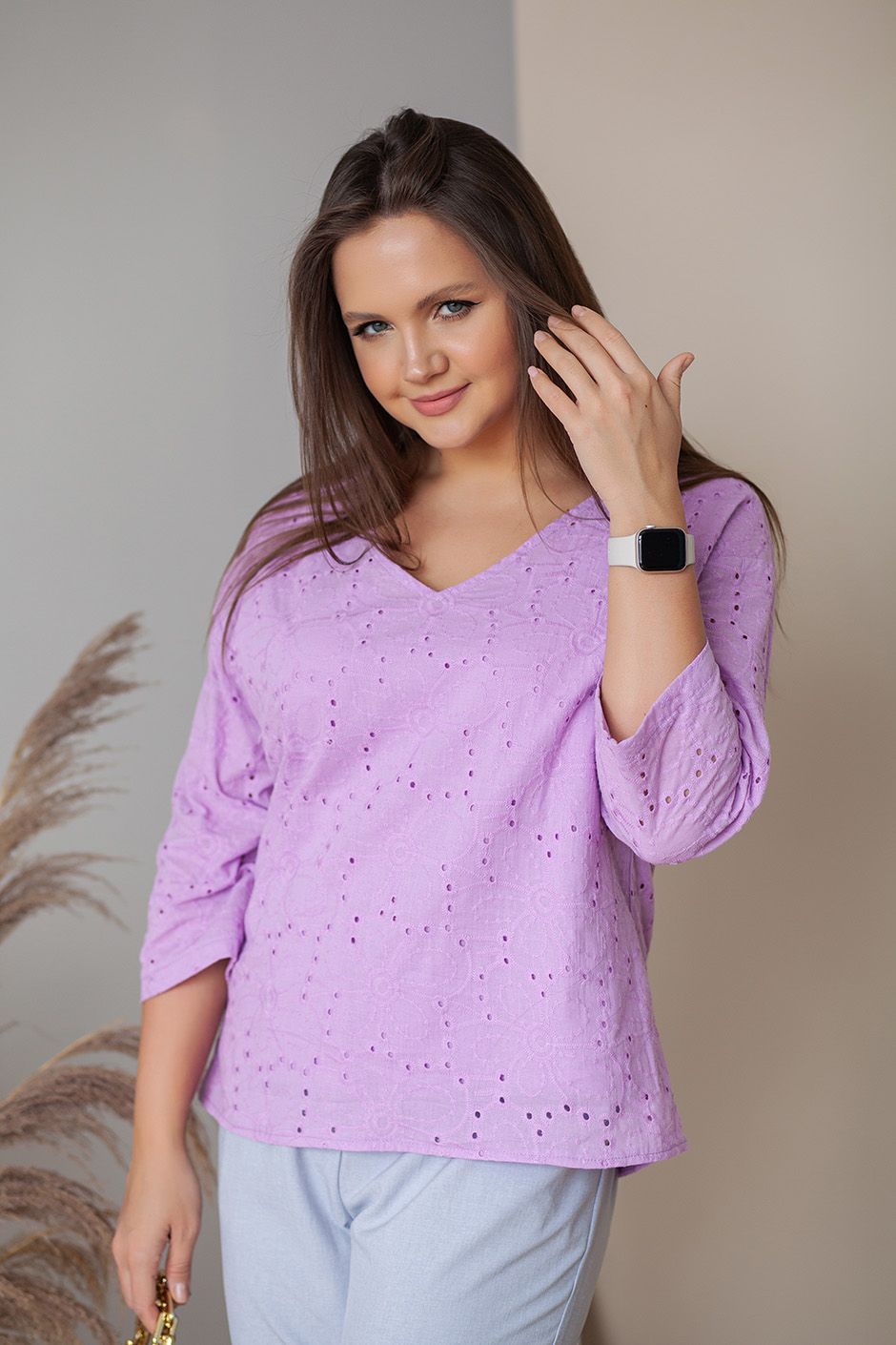 Ткань: хлопок-шитье. Блузка свободного прямого покроя, линия плеча занижена, вырез V-образный, по передней полочки подкладка в тон. Рукав свободный 3/4. Длина изделия ок.66см.