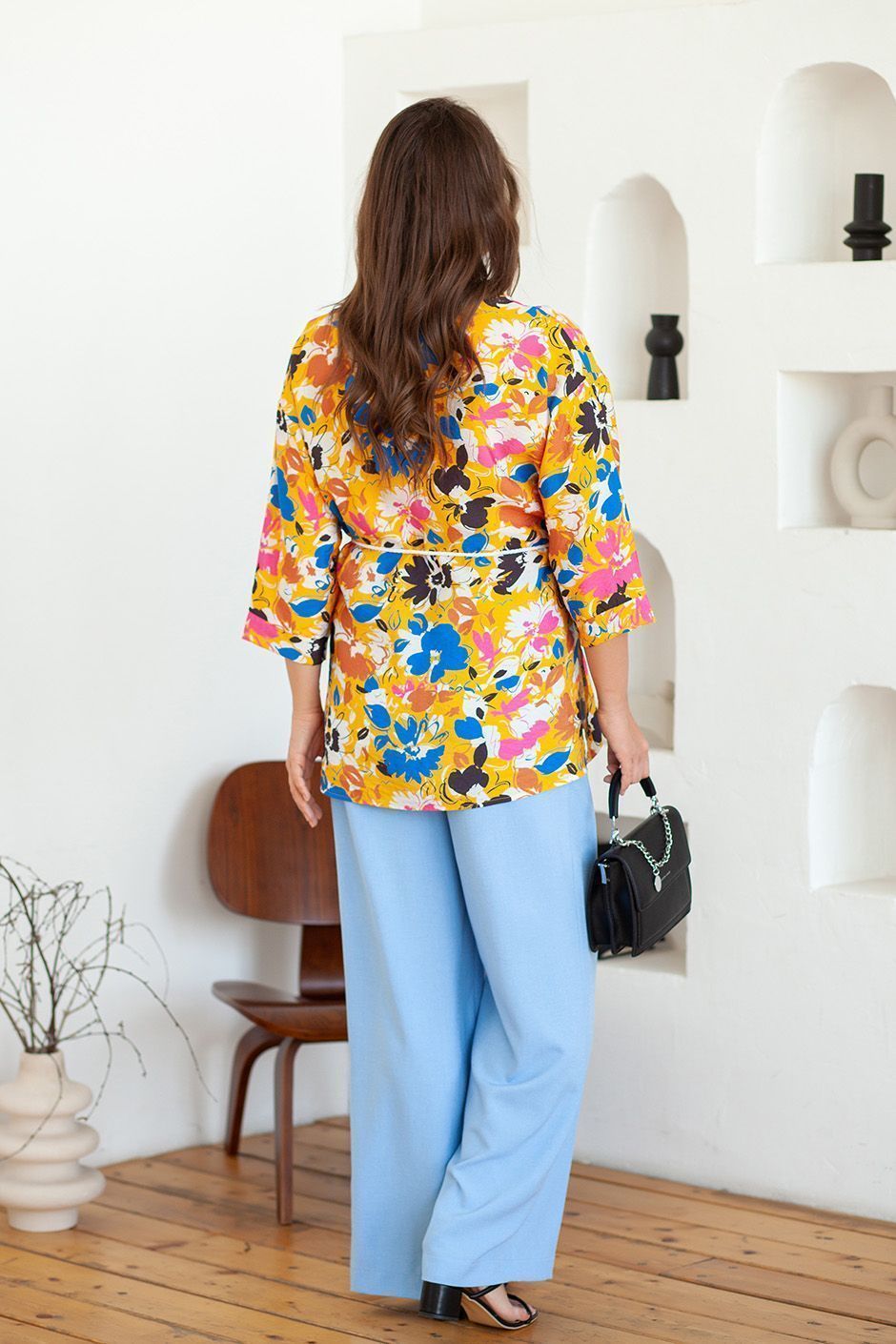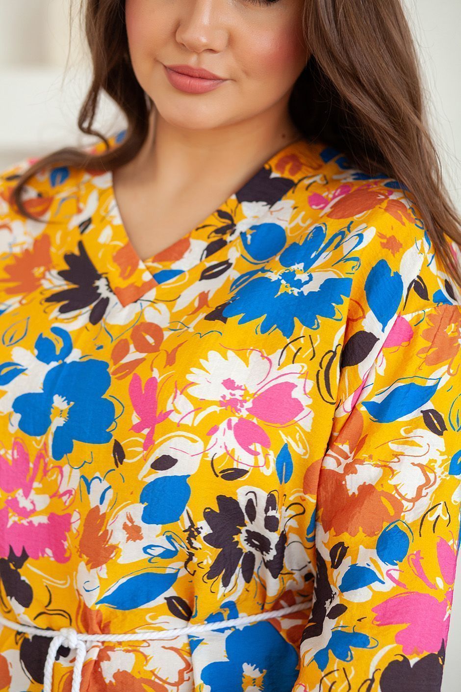 Ткань: хлопок набивной.Туника свободного покроя, вырез V образный, в боковых швах разрезы.Прилагается пояс шнур с кистями.Рукав 3/4 с манжетом. Длина изделия ок. 81см.