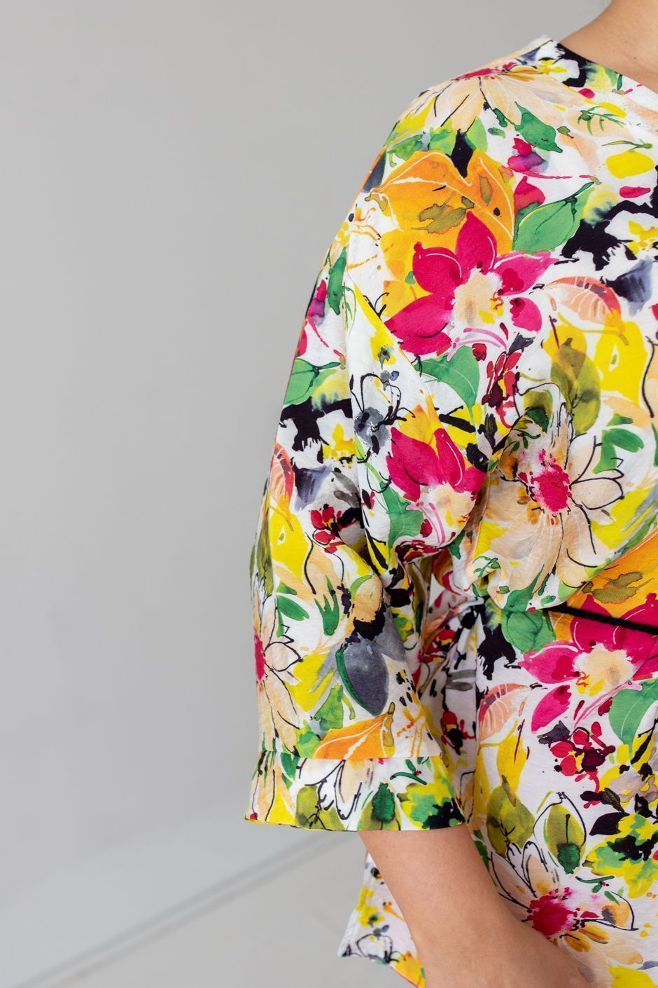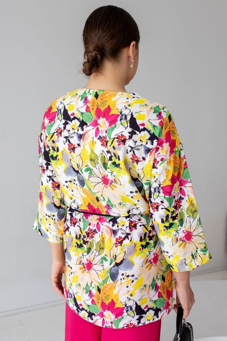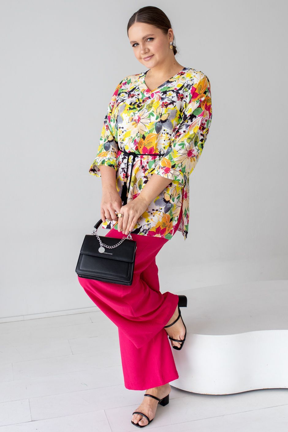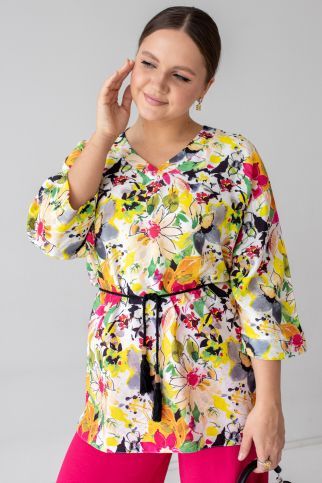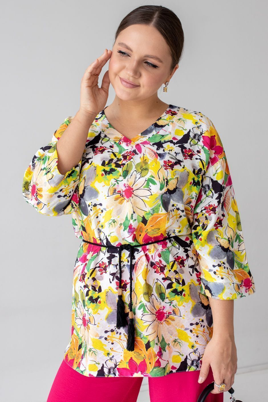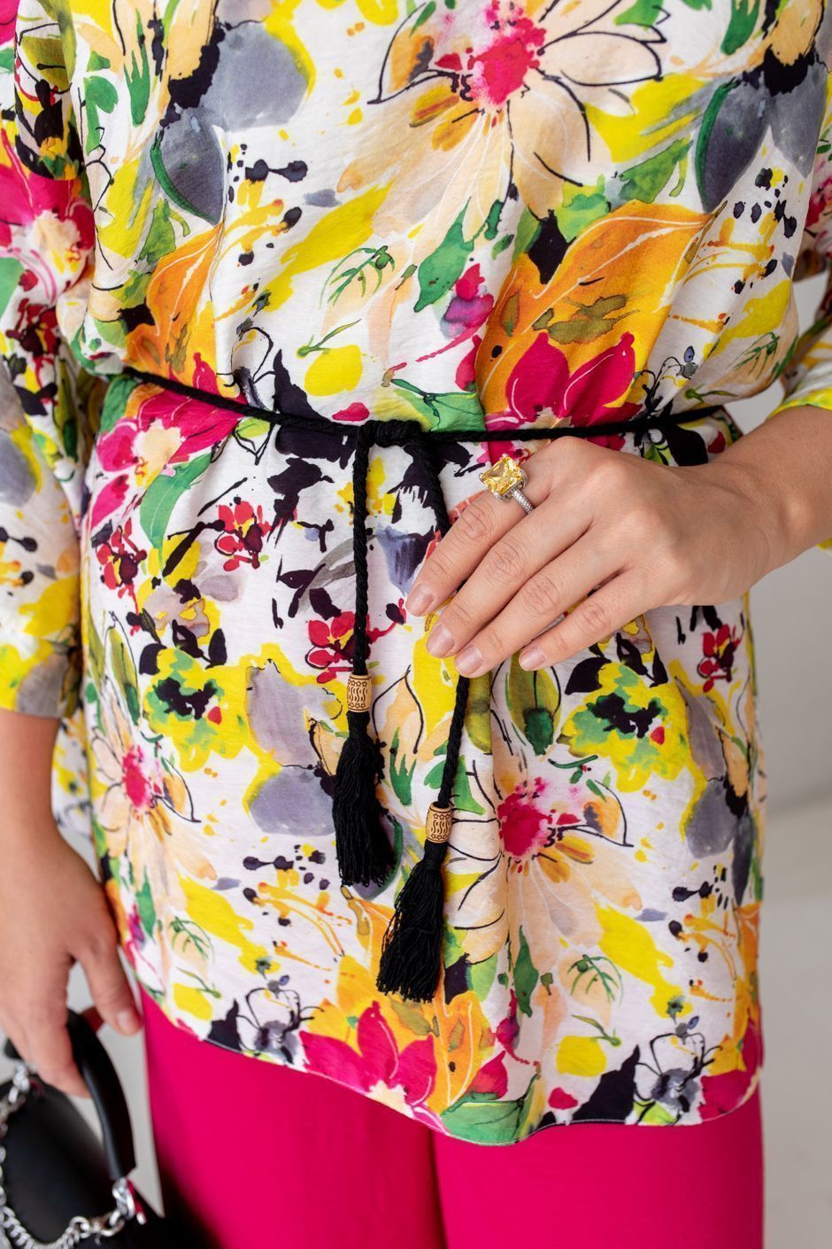 Ткань: хлопок набивной.Туника свободного покроя, вырез V образный, в боковых швах разрезы.Прилагается пояс шнур с кистями.Рукав 3/4 с манжетом. Длина изделия ок. 81см.
