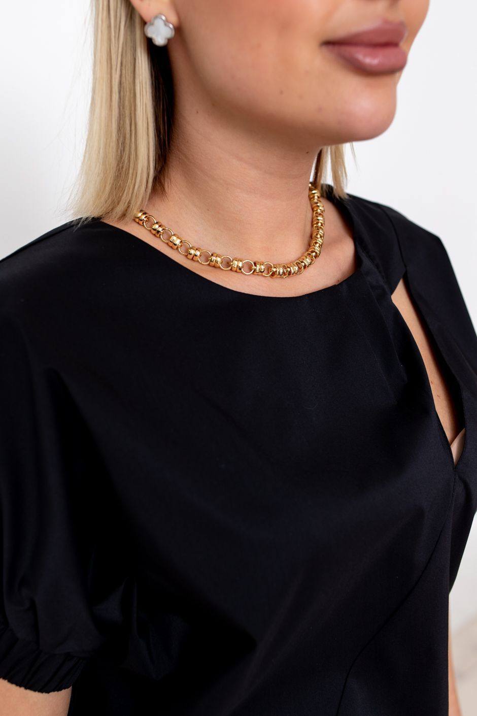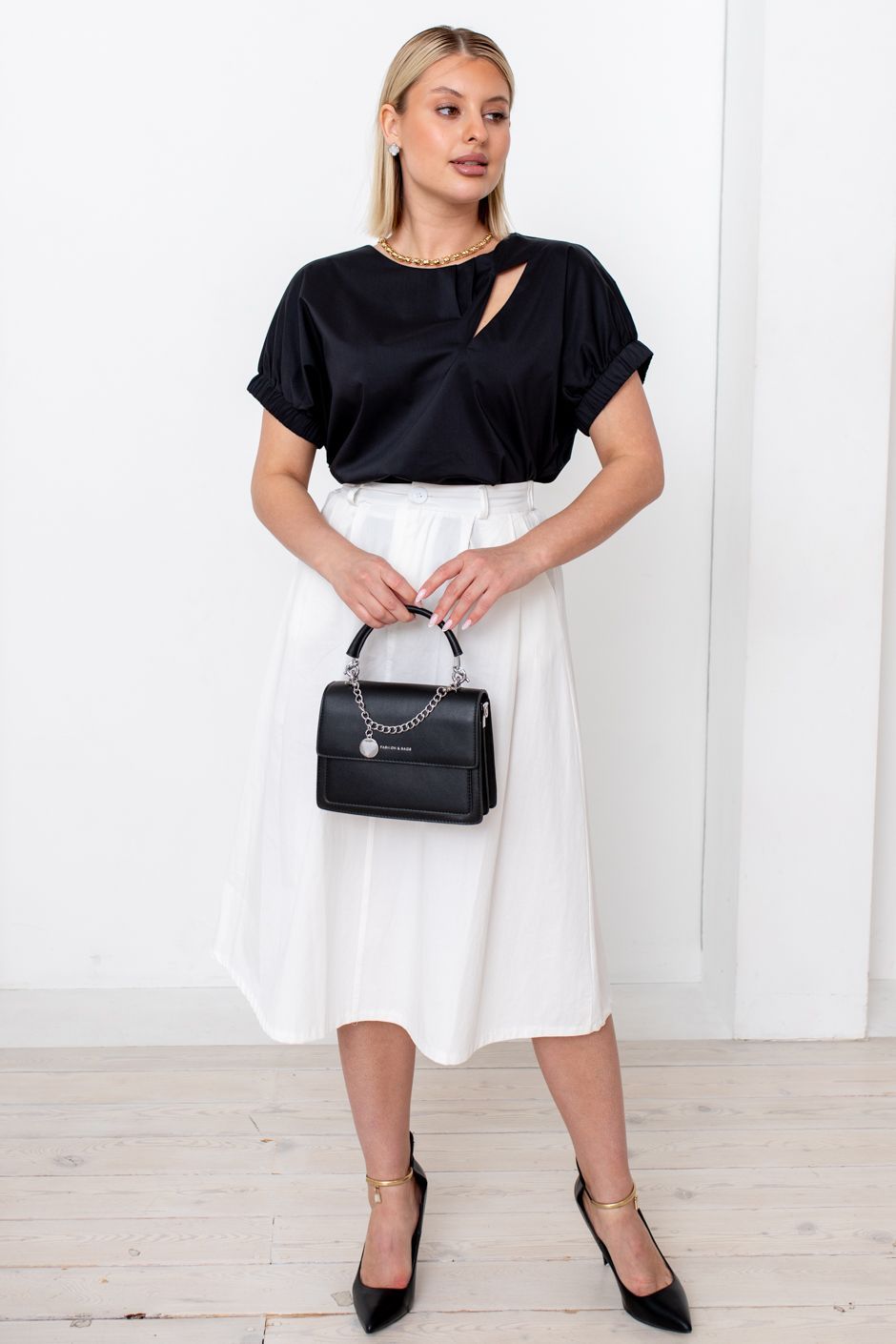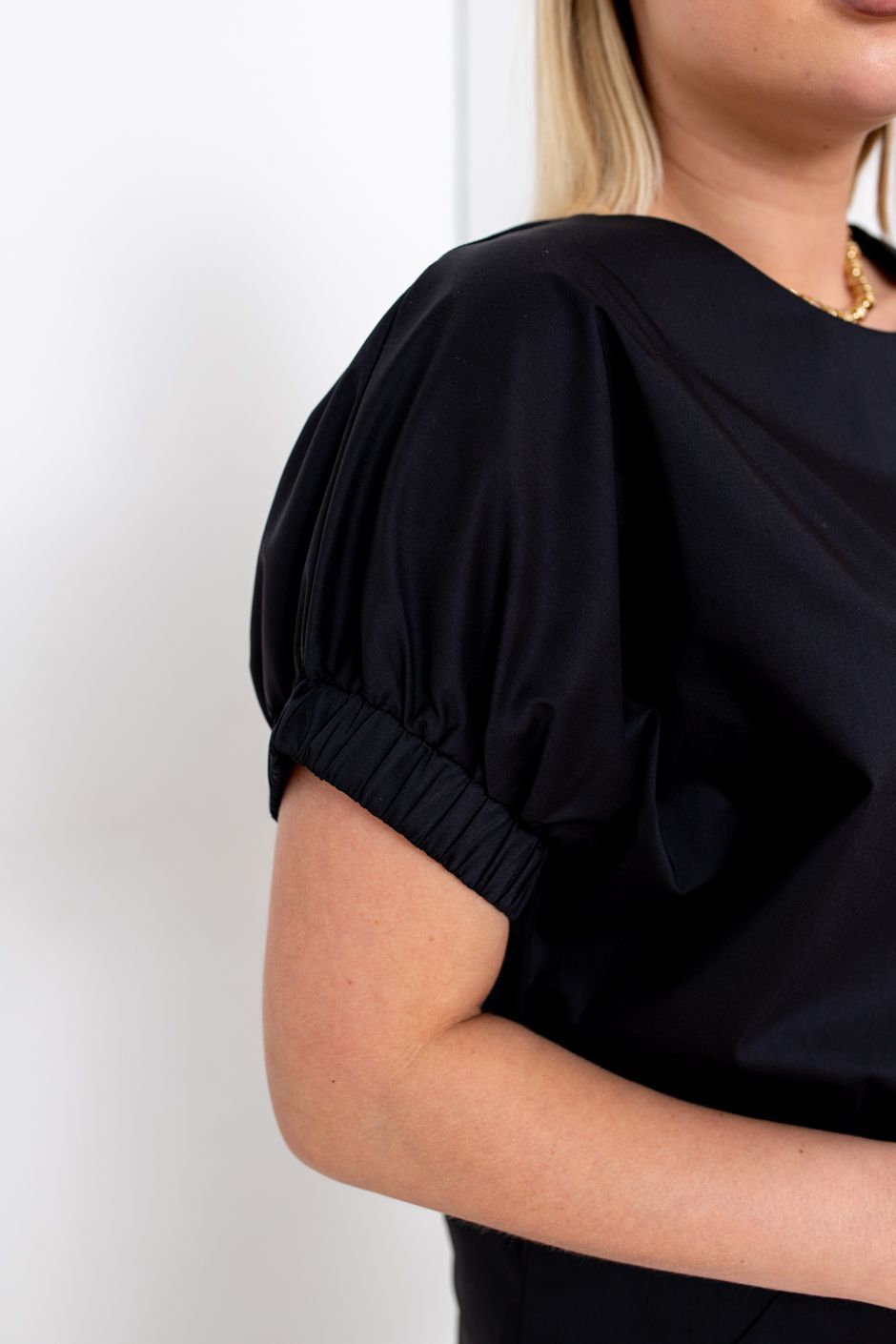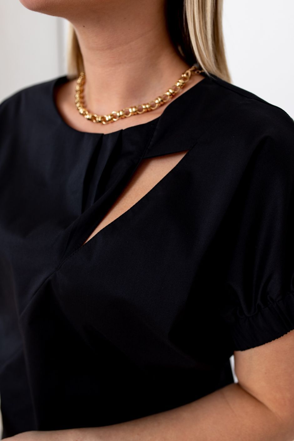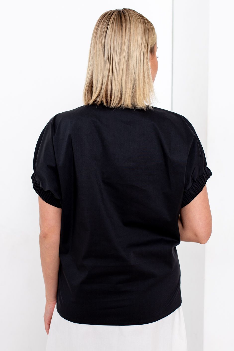 Ткань: хлопок однотонный. Блузка свободного покроя с цельнокроенным рукавом, по низу рукава на резине, спереди по горловине заложены складки, декоративный шов по диагонали, переходящий в открытый элемент . Рукав короткий.Длина изделия ок.62см.