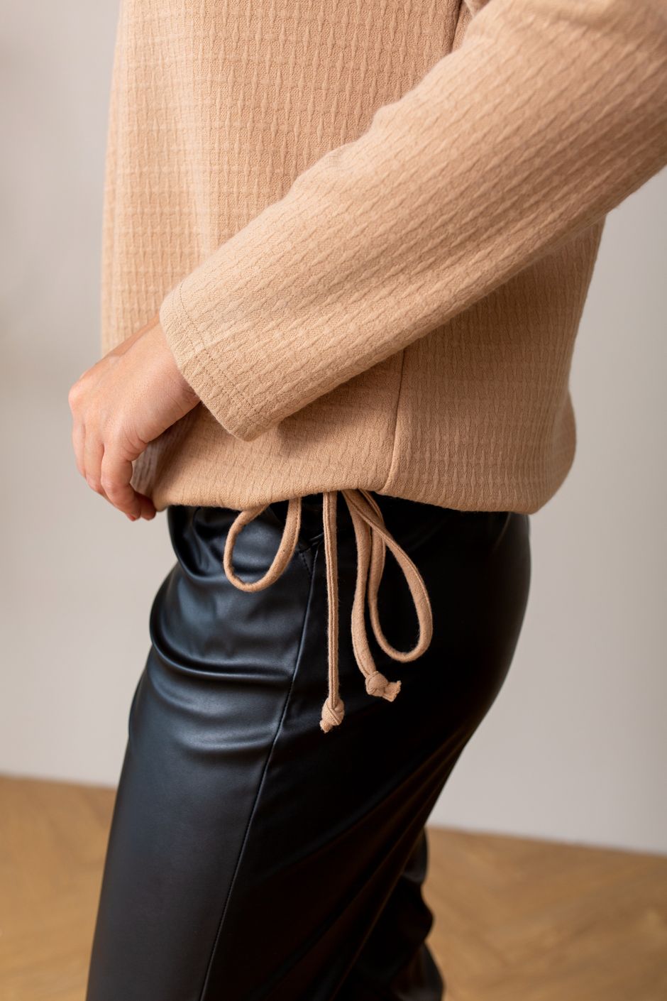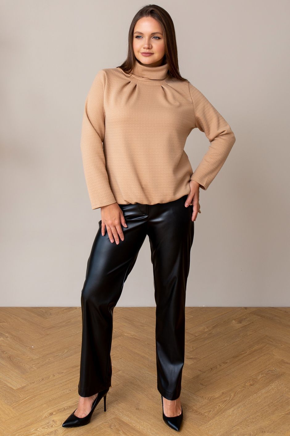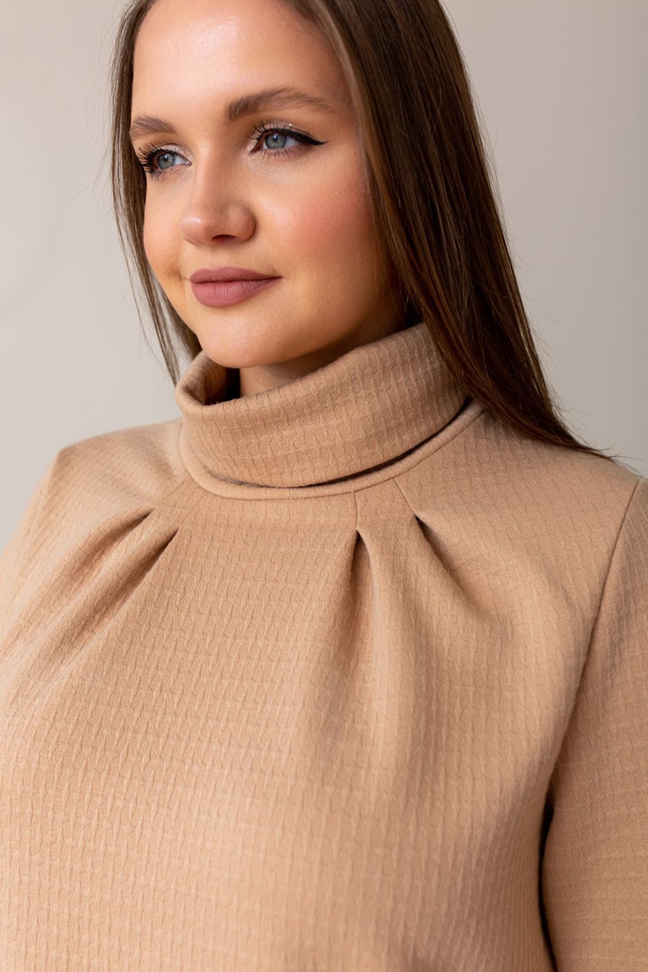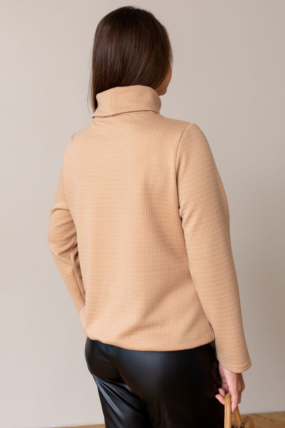 Ткань: трикотажное полотно "фукро" с декоративной выработкой.Джемпер прямого покроя, воротник-гольф, от выреза по две симметричных защипа. Рукав втачной, длинный. По низу изделия - кулиска, завязывающаяся с боку. Длина ок 64 см.