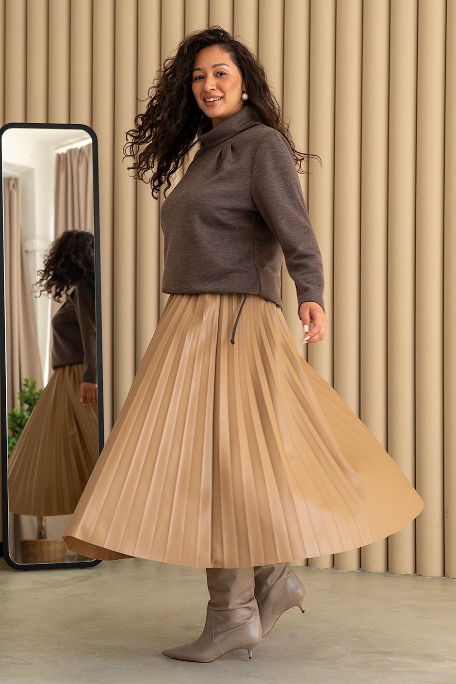Ткань: трикотажное полотно меланж. Джемпер прямого покроя, воротник-гольф, от выреза по две симметричных защипа. Рукав втачной, длинный. По низу изделия - кулиска, завязывающаяся с боку. Длина ок 64 см.