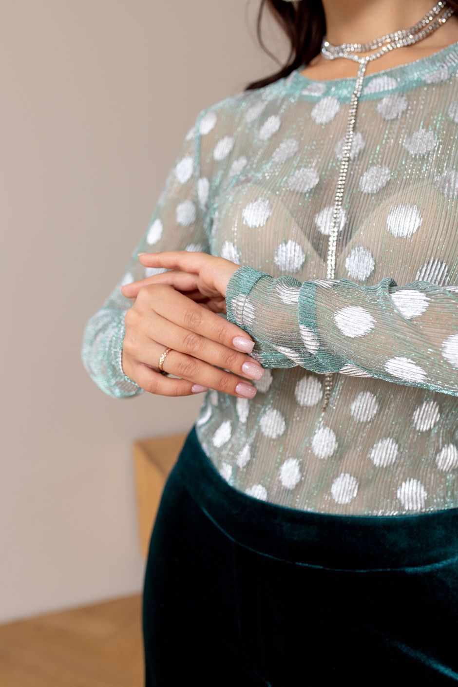 Ткань: сетка с люрексом. Лонгслив полуприлегающего покроя, с небольшим вырезом. Рукав длинный. Длина ок.64см